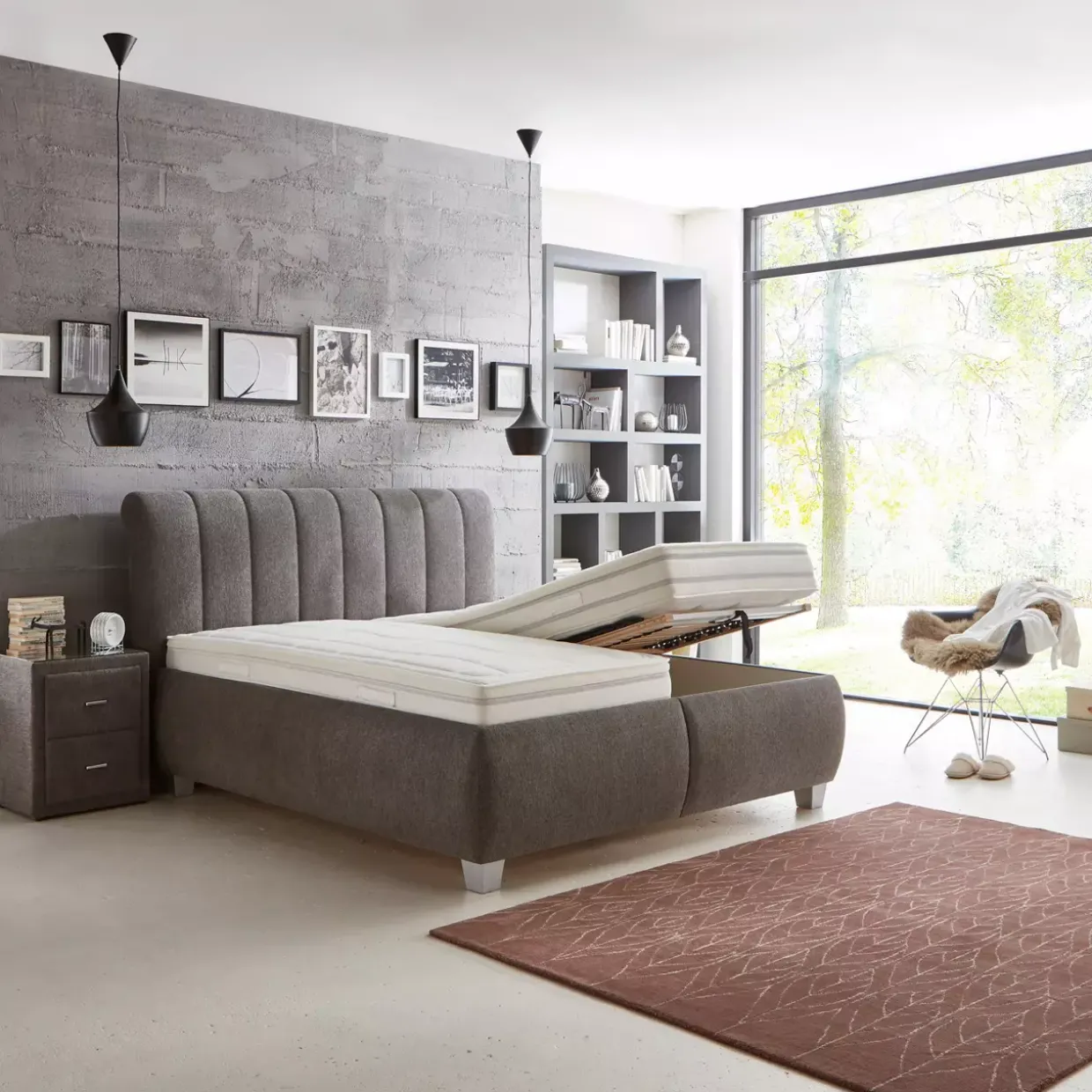 Ein Großraumbettkasten, der durch einen aufklappbaren Lattenrost zugänglich ist, bietet großzügigen Stauraum und damit mehr Ordnung im Schlafzimmer. Das Polsterbett Messina vereint modernes Design mit praktischen Funktionen und wird so zum Highlight in jedem Raum. Die stilvolle Kombination aus Stoff und Kunststoff in den Farben Brego Grau und Silber verleiht dem Bett eine elegante und zeitgemäße Optik, die sich harmonisch in verschiedene Einrichtungsstile einfügt.