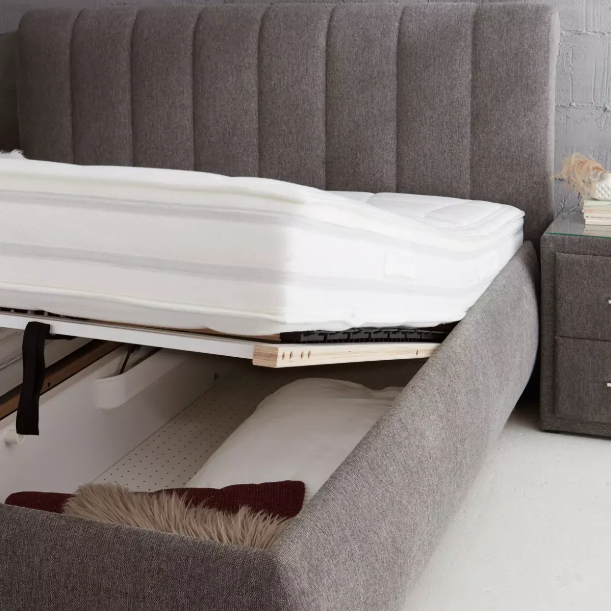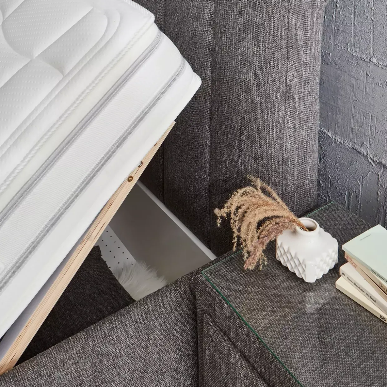 Eine Luxus-Gasdruckfeder ermöglicht das mühelose Anheben des Lattenrosts und die komfortable Nutzung des Stauraums darunter. Diese durchdachte Funktionalität macht das Messina Polsterbett zu einem vielseitigen Möbelstück, das sowohl Komfort als auch Nutzen bietet. In einer limitierten Anzahl von nur 26 Exemplaren erhältlich, verbindet dieses Bett exklusives Design mit einem hohen Maß an Praktikabilität. Ein Möbelstück, das nicht nur durch seine Ästhetik, sondern auch durch seine Funktionalität überzeugt.