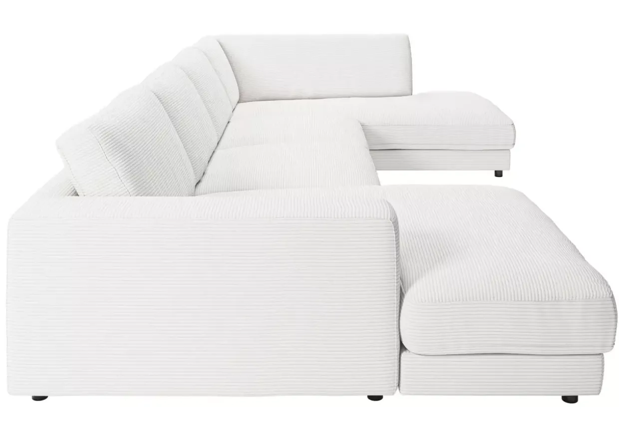 Ein weiteres Highlight ist der hochwertige Cordstoff, der durch seine robuste Struktur und angenehme Haptik überzeugt. Der Stoff ist frei von Mustern und Motiven und sorgt für eine ruhige und klare Optik. Besonders hervorzuheben ist, dass die Rückseite echt bezogen ist, was die Polstergarnitur freistellbar macht und somit vielseitige Platzierungsmöglichkeiten bietet.