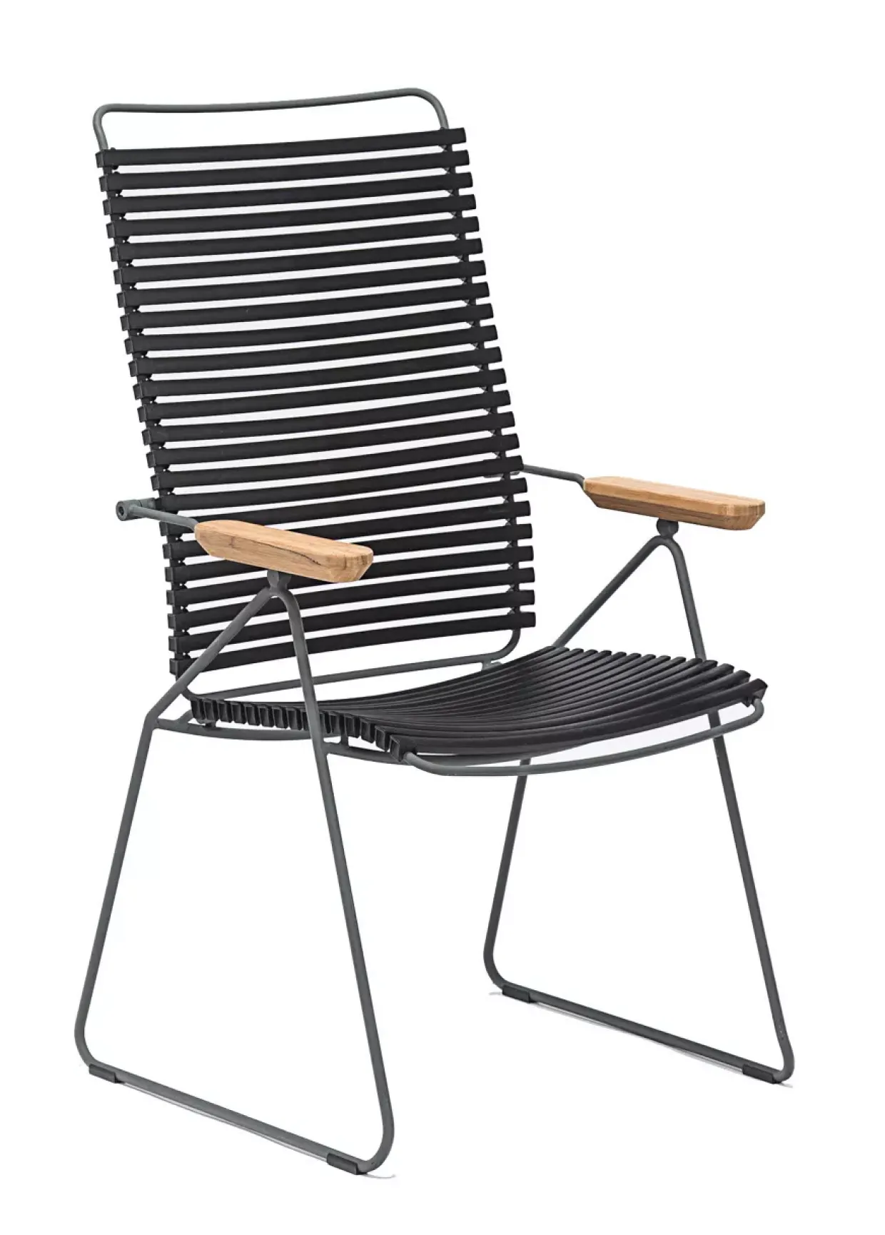 Ein stilvolles Design prägt den modernen Positions-Stuhl, der mit seiner grauen Farbgebung in jede Umgebung passt. Die pulverbeschichtete Oberfläche verleiht dem Stuhl nicht nur eine ansprechende Optik, sondern sorgt auch für Langlebigkeit und Schutz vor äußeren Einflüssen. Die Kombination aus Kunststoff, Metall und Holzwerkstoff schafft ein harmonisches Zusammenspiel von Materialien, das durch die Verwendung von robustem Stahl zusätzlich verstärkt wird.Besondere Aufmerksamkeit verdient die Relaxfunktion dieses Stuhls. Die verstellbare Rückenlehne ermöglicht es Ihnen, Ihren Sitzkomfort individuell anzupassen und Momente der Entspannung zu genießen. Die stilvollen Armlehnen aus Bambus bieten dabei eine natürliche Haptik und fügen sich nahtlos in das Gesamtdesign ein. Ein weiteres Highlight sind die schwarzen Kunststoff-Lamellen, die sowohl Sitzschale als auch Rücken zieren. Diese sind nicht nur ästhetisch ansprechend, sondern auch UV- und witterungsbeständig. Sollten Sie Abwechslung wünschen, sind die Lamellen austauschbar und in weiteren Farben erhältlich.Der Stuhl mit Kufenfußform bietet nicht nur Stabilität, sondern auch eine moderne Ästhetik, die im Innen- und Außenbereich überzeugt. Genießen Sie einen Sitzplatz, der Funktionalität mit einem Hauch von Luxus verbindet.