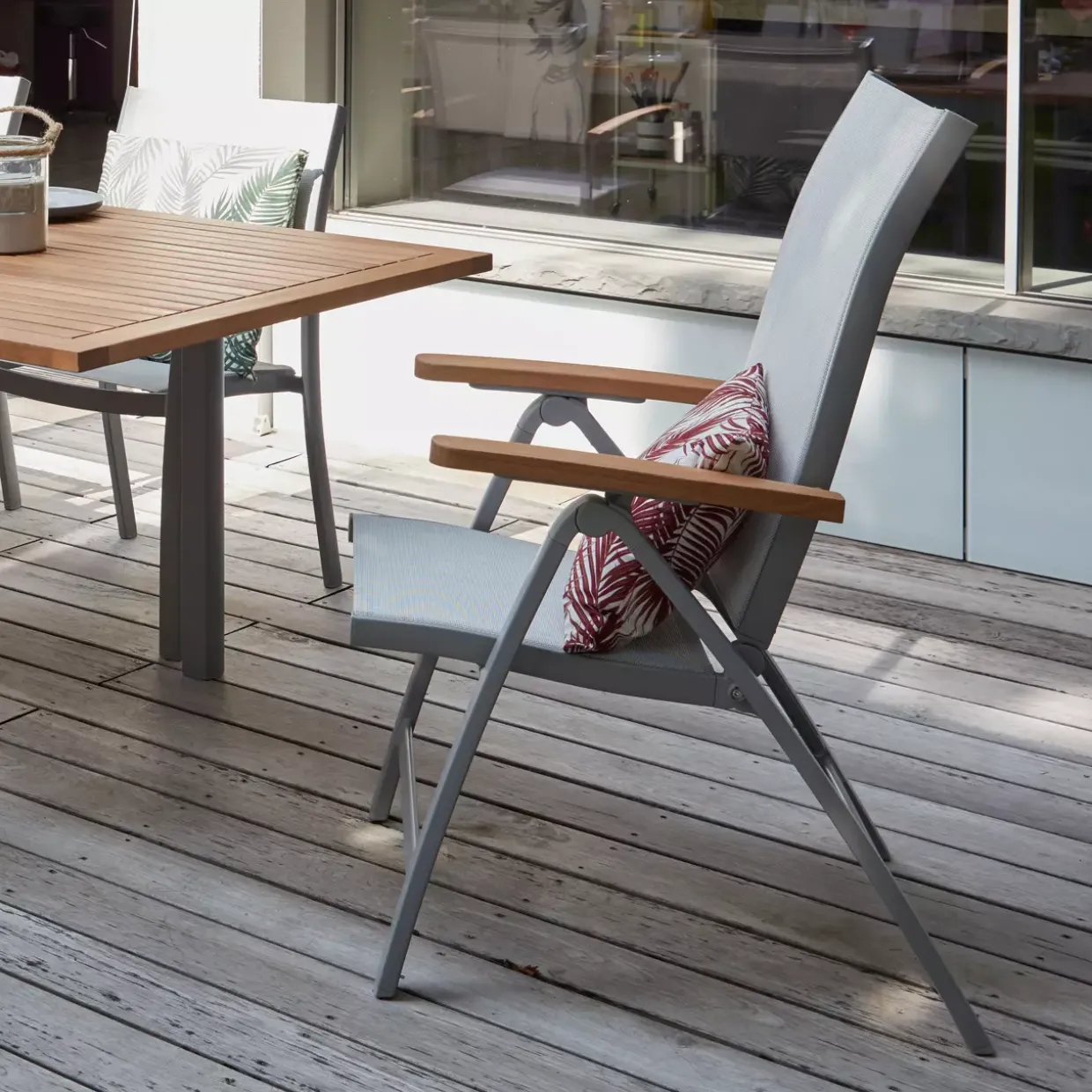 Ein Sommerabend auf der Terrasse wird zum Genuss, wenn Sie sich in die komfortable Sitzfläche des Positionsstuhls zurücklehnen. Das 4-Fußgestell bietet eine stabile Basis und verbindet Funktionalität mit einem Hauch von Raffinesse. Die Verwendung von hochwertigen Materialien wie Kunststoff, Textil, Metall und Holz sorgt für Langlebigkeit und Widerstandsfähigkeit gegen die Elemente.