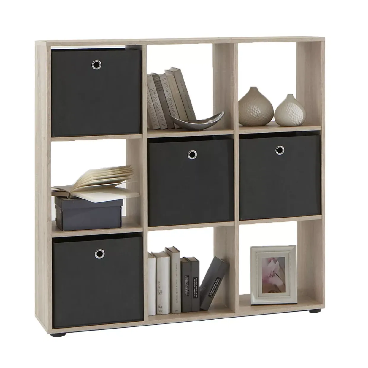 Eiche Nachbildung verleiht dem Raumteiler-Regal einen modernen und zugleich warmen Charme. Dieses Möbelstück eignet sich ideal für eine stilvolle und funktionale Raumgestaltung. Mit seinen neun Fächern bietet es ausreichend Platz, um Bücher, Dekorationsgegenstände oder persönliche Schätze ansprechend zu präsentieren.