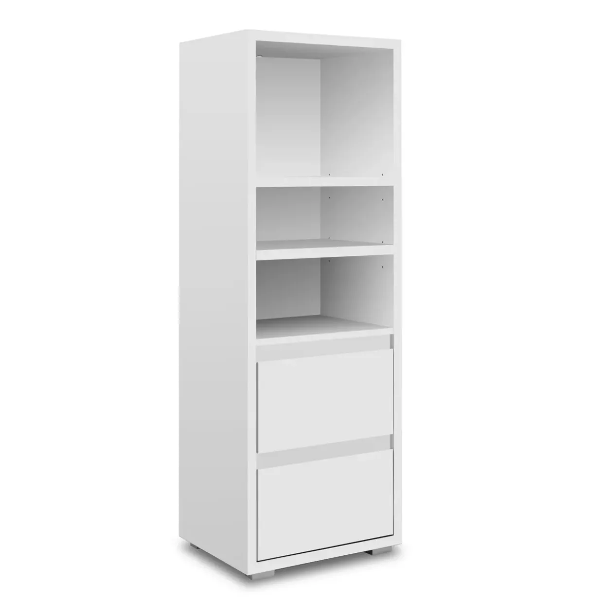 Ein modernes Design zeichnet das Image Regal aus, das durch seine klare Linienführung und stilvolle Farbgebung besticht. In einer Mischung aus weiß matt und alufarben fügt es sich harmonisch in jede zeitgemäße Inneneinrichtung ein. Die Kombination aus Holzwerkstoff und Kunststoff sorgt für Stabilität und Langlebigkeit, während das 4-Fußgestell dem Regal eine solide Basis verleiht.