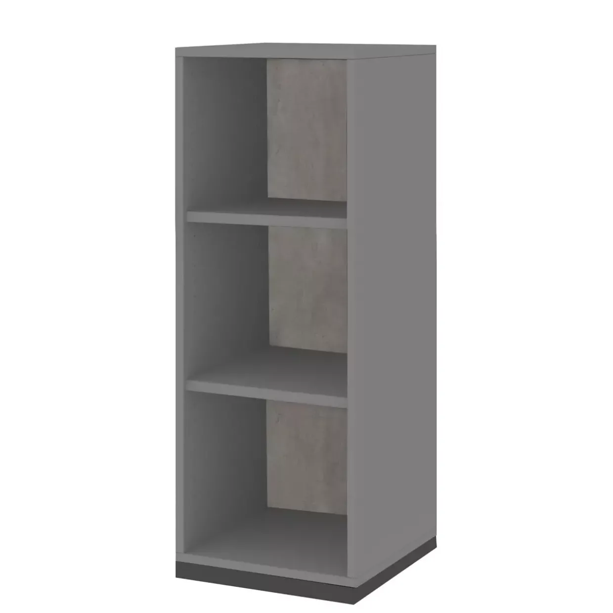 Die quarzitfarbene Sichtrückwand setzt einen stilvollen Akzent und harmoniert perfekt mit dem anthrazitfarbenen Holzsockel. Zwei Einlegeböden bieten ausreichend Platz für Bücher, Dekoration oder andere Gegenstände, während die offene Bauweise für eine luftige und einladende Atmosphäre sorgt.