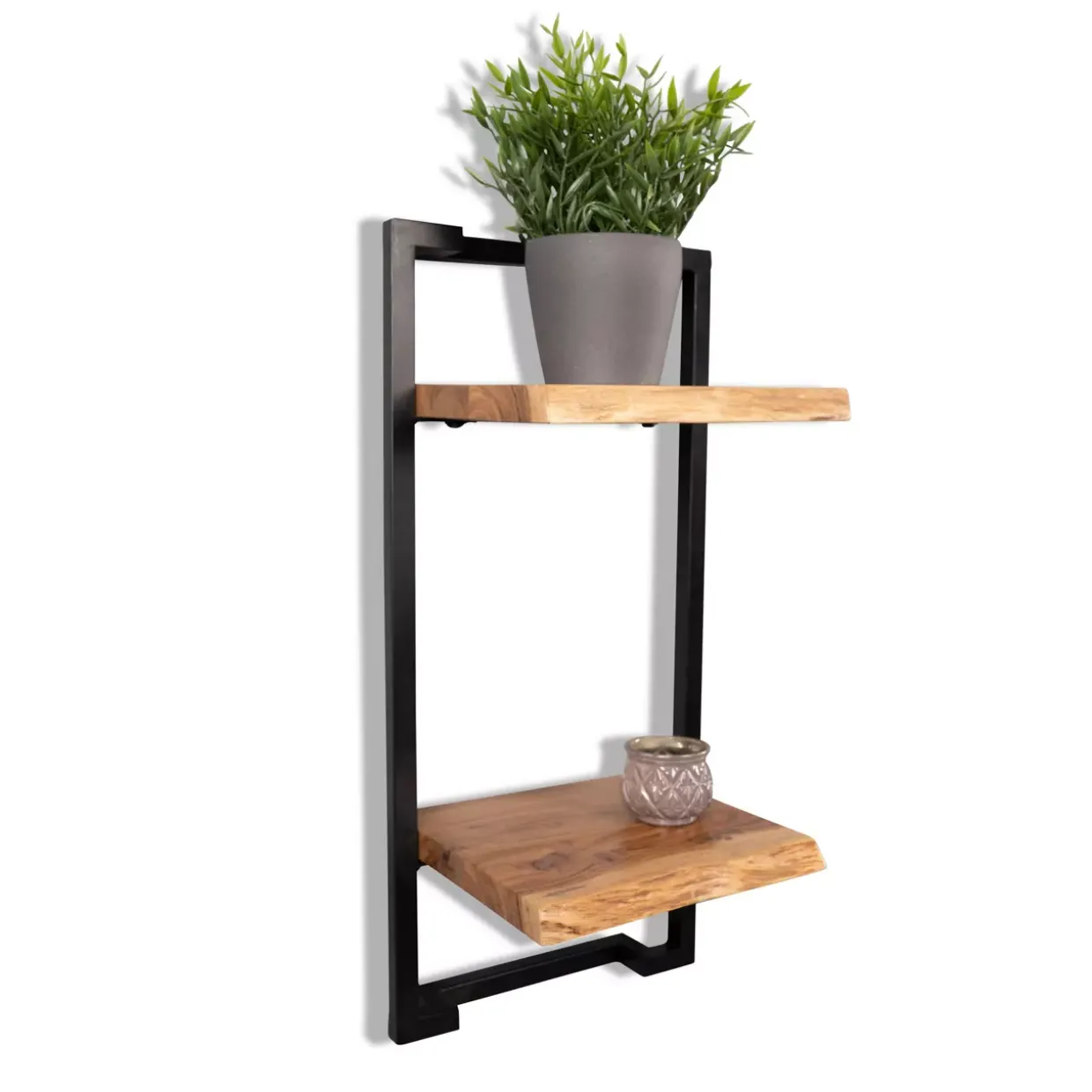 Das Regal Angola 4 besticht durch sein modernes Design, das sich nahtlos in jedes stilvolle Interieur einfügt. Die Kombination aus massivem Akazienholz und schwarzen Metallrahmen verleiht diesem Möbelstück eine zeitlose Eleganz. Die natürliche Maserung des Holzes bietet einen charmanten Kontrast zu den klaren Linien des schwarzen Metalls, was dem Regal einen einzigartigen Charakter verleiht.