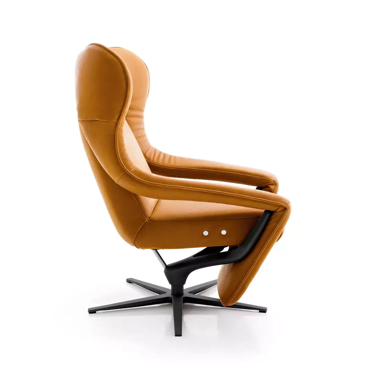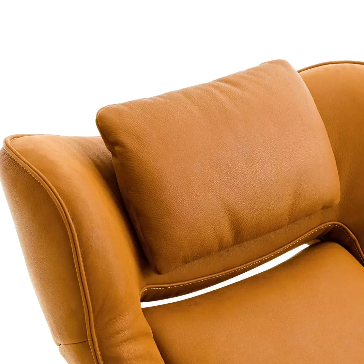 Für zusätzlichen Komfort sorgt das Nackenkissen mit Gewichtspendel, das optional erhältlich ist. Auch ein Akku kann gegen Aufpreis hinzugefügt werden, um die Bewegungsfreiheit weiter zu erhöhen. Der Rücken des Sessels ist echt bezogen, was die hohe Qualität des Möbelstücks unterstreicht.