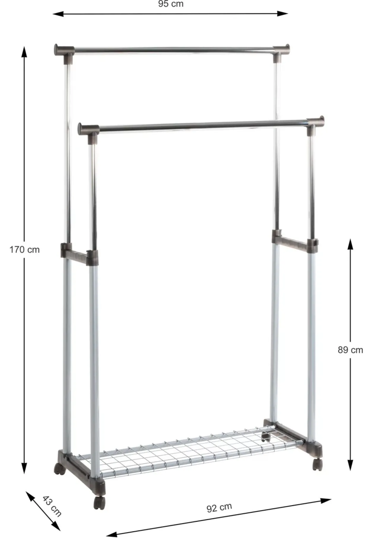 Mit zwei Einheiten bietet diese praktische Lösung genügend Platz für Ihre Garderobe und mehr. Die robuste Konstruktion aus Kunststoff und Metall sorgt für eine langlebige Nutzung. Zudem ermöglichen die Rollen eine flexible Positionierung, sodass Sie die Garderobe mühelos an jede gewünschte Stelle verschieben können.