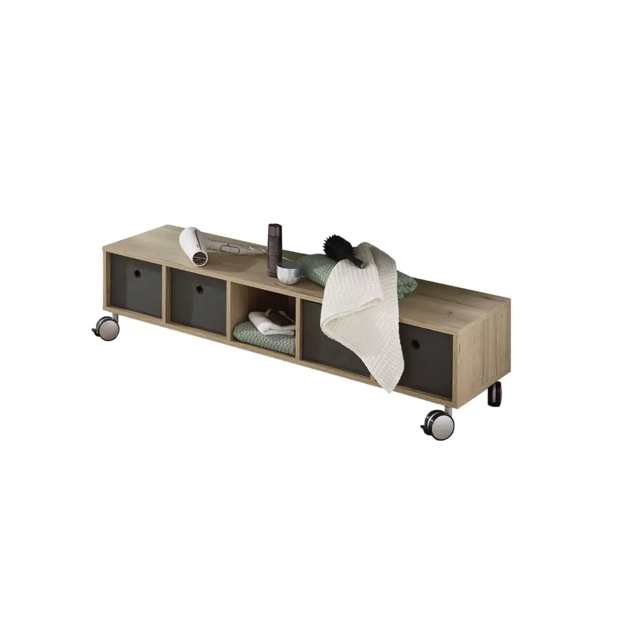 Der moderne Stil des Palino Rollwagens verleiht jedem Raum eine elegante und zeitgemäße Note. Aus hochwertigem Holzwerkstoff gefertigt, überzeugt dieses Möbelstück nicht nur durch seine Funktionalität, sondern auch durch seine ansprechende Optik in Halifax Eiche Nachbildung. Die robuste Bauweise sorgt dafür, dass der Rollwagen langlebig und stabil ist. Mit einer durchdachten Fußform auf Rollen lässt sich der Wagen mühelos in Ihrem Wohn- oder Arbeitsbereich bewegen. Dies macht ihn zu einem flexiblen Begleiter in Ihrem Alltag. Die Fächerbreiten von 26 cm bieten Ihnen ausreichend Platz, um verschiedene Gegenstände organisiert und griffbereit zu halten. Ob Akten, Bücher oder Dekorationen – alles findet seinen Platz.Ein echter Alleskönner, der durch seine schlichte Eleganz und Funktionalität überzeugt. Die Kombination aus modernem Design und praktischen Eigenschaften macht diesen Rollwagen zu einem unverzichtbaren Element in Ihrem Zuhause. Auch in engen Räumen oder unter Schreibtischen findet er dank seiner kompakten Bauweise problemlos seinen Platz. Lassen Sie sich von der Vielseitigkeit und dem zeitlosen Design inspirieren und entdecken Sie, wie einfach es sein kann, Ordnung mit Stil zu verbinden. Der Palino Rollwagen ist nicht nur ein Möbelstück, sondern ein durchdachter Helfer für Ihren Alltag.