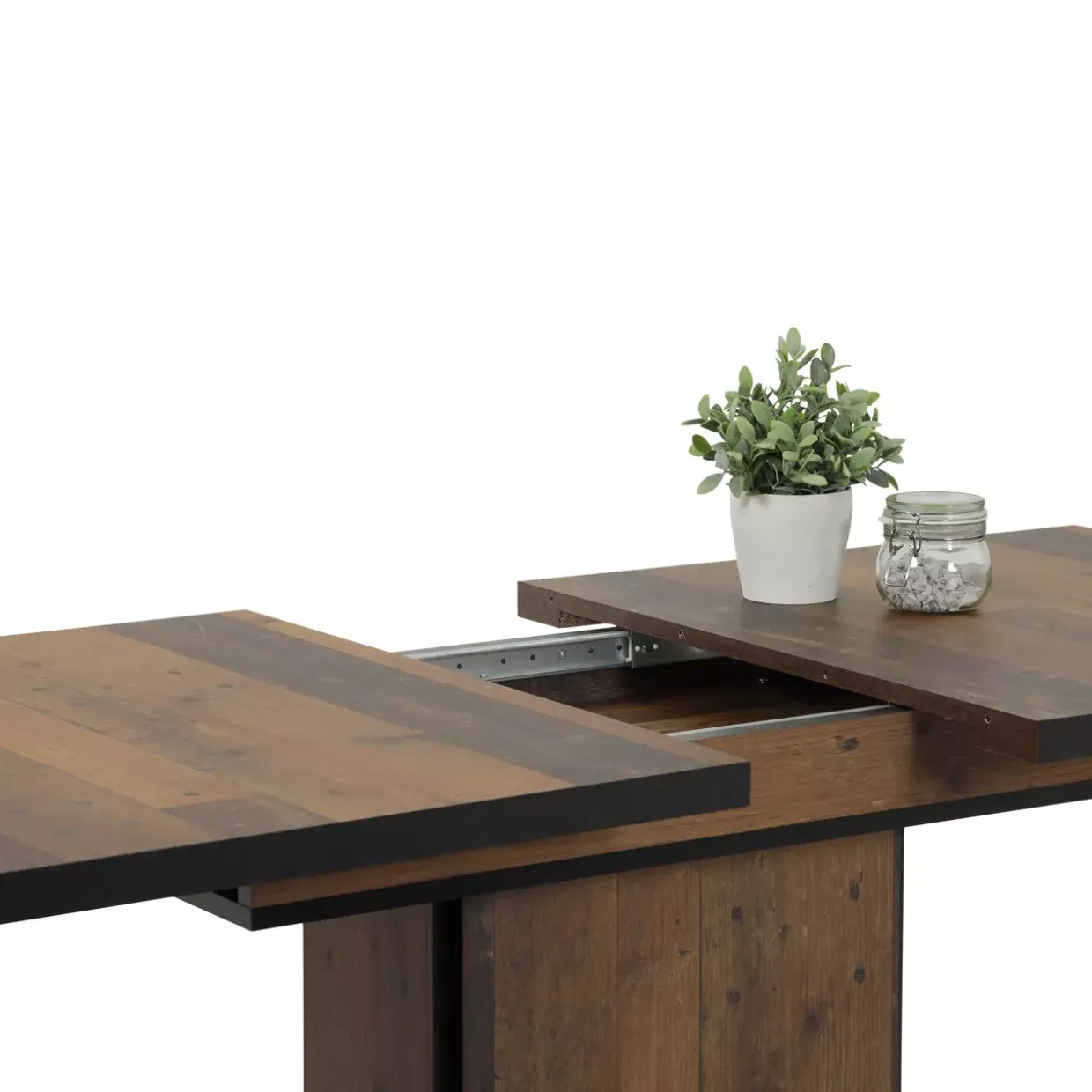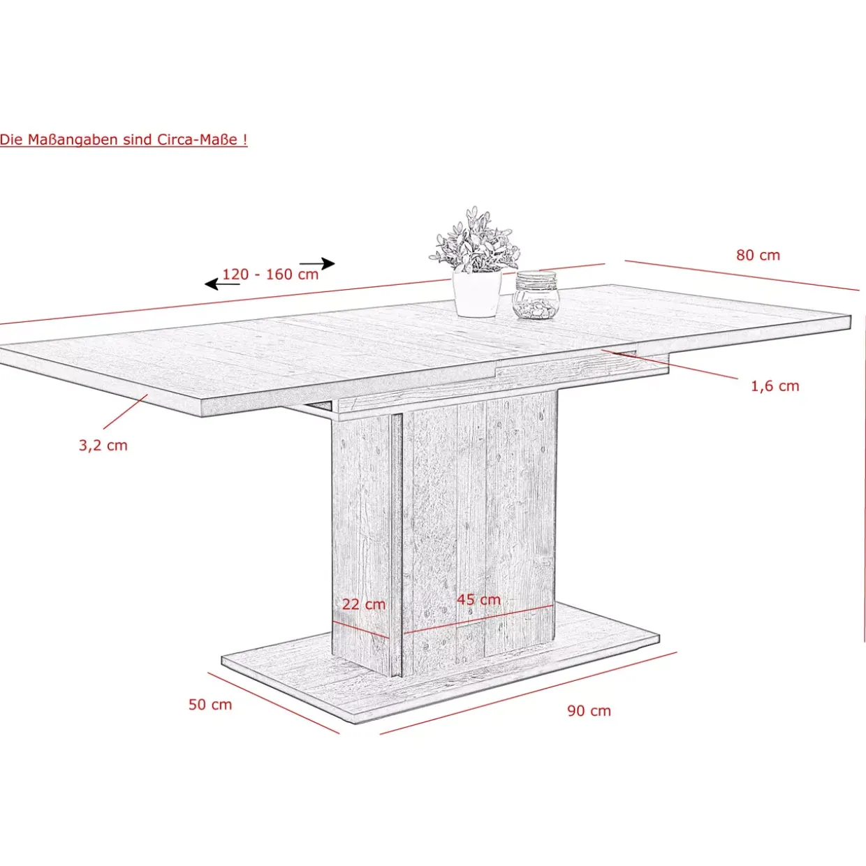 Säulentisch,Tischplatte ausziehbar mit Arretierung,Innenliegende Einlegeplatte,Alle Tischkanten farblich abgesetzt,Holzwerkstoff
