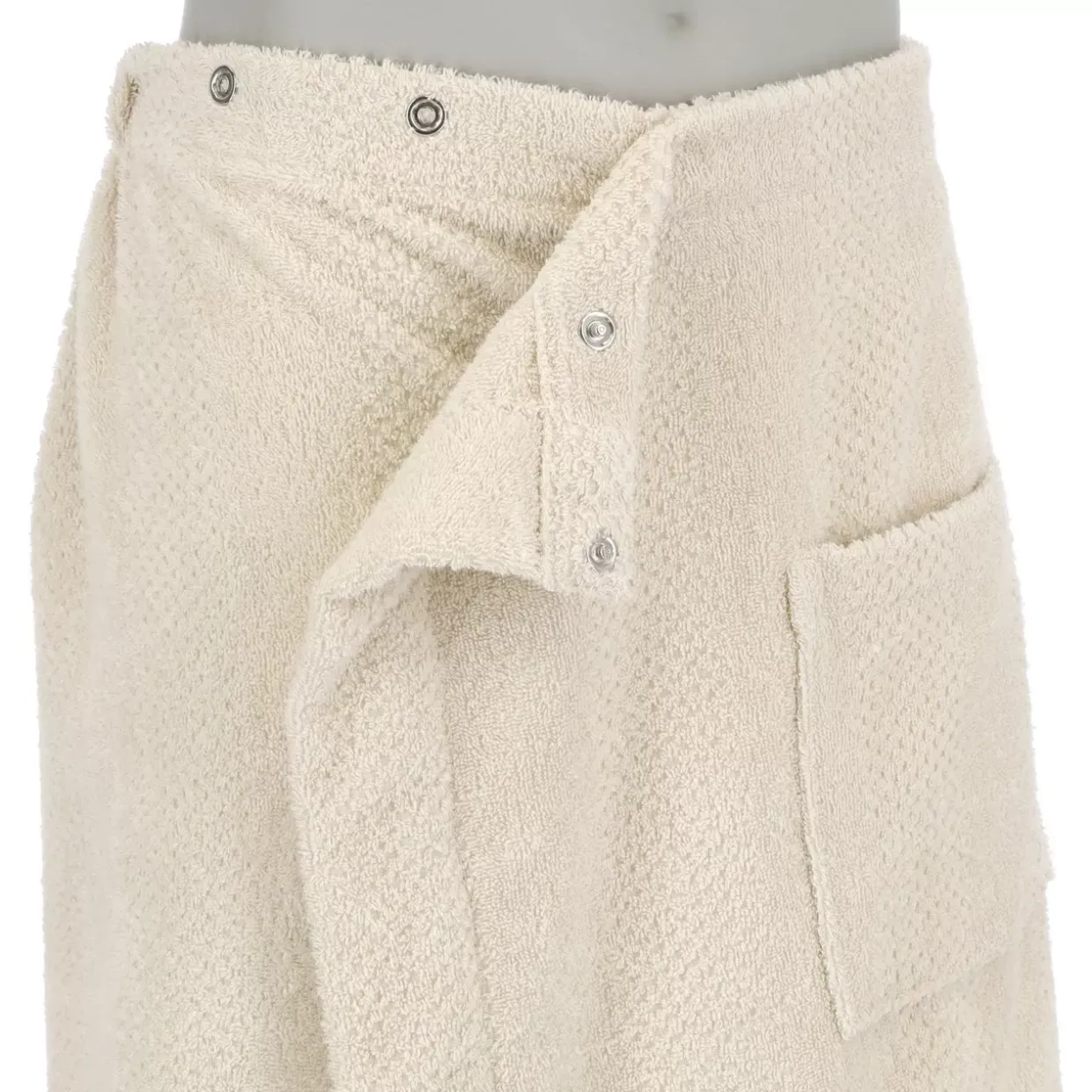 Die Gewebestruktur des Kilts ist gewebt, wodurch er besonders strapazierfähig und langlebig ist. Der Saunakilt ist mit Druckknöpfen versehen, die Ihnen ein einfaches und sicheres Befestigen ermöglichen.
