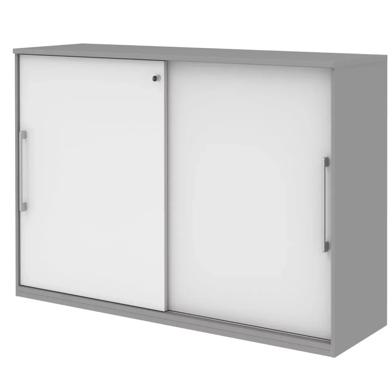 Mittelgrau, weiß und alufarbig – diese harmonische Farbpalette fügt sich nahtlos in unterschiedliche Einrichtungsstile ein. Die vier Einlegeböden und eine Mittelseite bieten Flexibilität, um den Stauraum individuell zu gestalten.