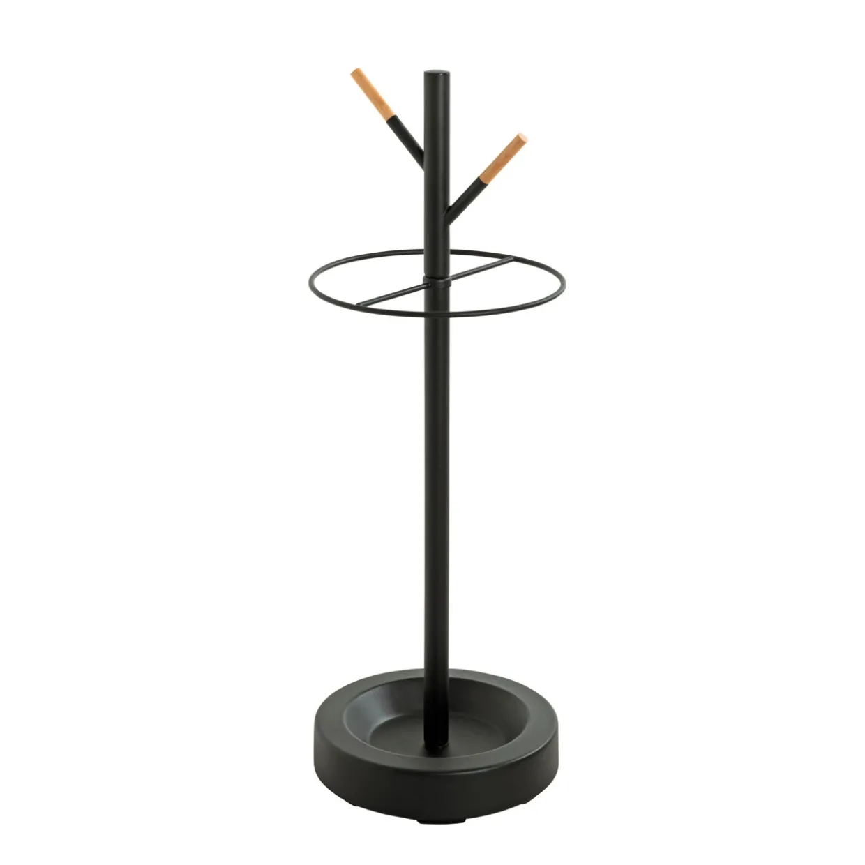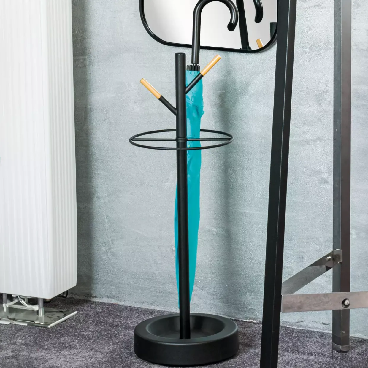 Dieser Schirmständer besteht aus einer Kombination von hochwertigem Holzwerkstoff und Metall, was ihm eine robuste und langlebige Struktur verleiht. Die Oberfläche in Buche und das schwarze Metallgestell schaffen einen ansprechenden Kontrast, der sich nahtlos in verschiedene Einrichtungsstile einfügt, von modern bis klassisch.