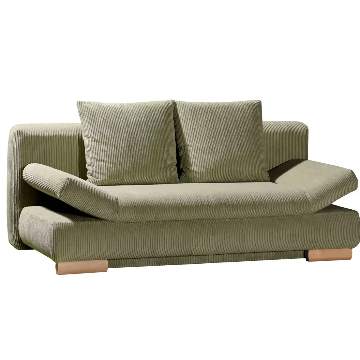 Olivfarbener Cordstoff trifft auf die natürliche Schönheit von Buche Holz und vereint sich zu einem modernen Schlafsofa, das stilvolle Eleganz in Ihr Wohnzimmer bringt. Die klaren Linien und die einfarbige Stoffausführung unterstreichen den zeitgenössischen Stil, der perfekt für anspruchsvolle Designliebhaber ist. Mit einem Federkern, eingebettet in Polyschaum und Wattevlies, bietet das Sofa hohen Sitzkomfort und lädt zum Entspannen ein.