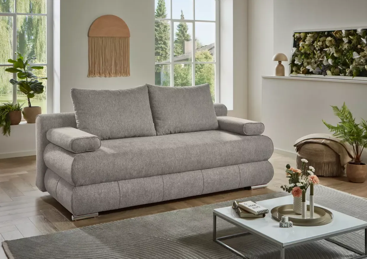 Ergonomie trifft auf Funktionalität: Die Rückenlehne des modernen Schlafsofas Borna lässt sich mühelos klappen, was den Komfort erheblich steigert. Mit einem stilvollen Design in einem eleganten Grauton und edlem Edelstahl fügt sich dieses Möbelstück harmonisch in jedes zeitgemäße Interieur ein. Flexibilität ist hier ein zentrales Element. Die Sitzfläche ist vorziehbar, was eine einfache Umwandlung von einem Sofa in ein gemütliches Bett ermöglicht.