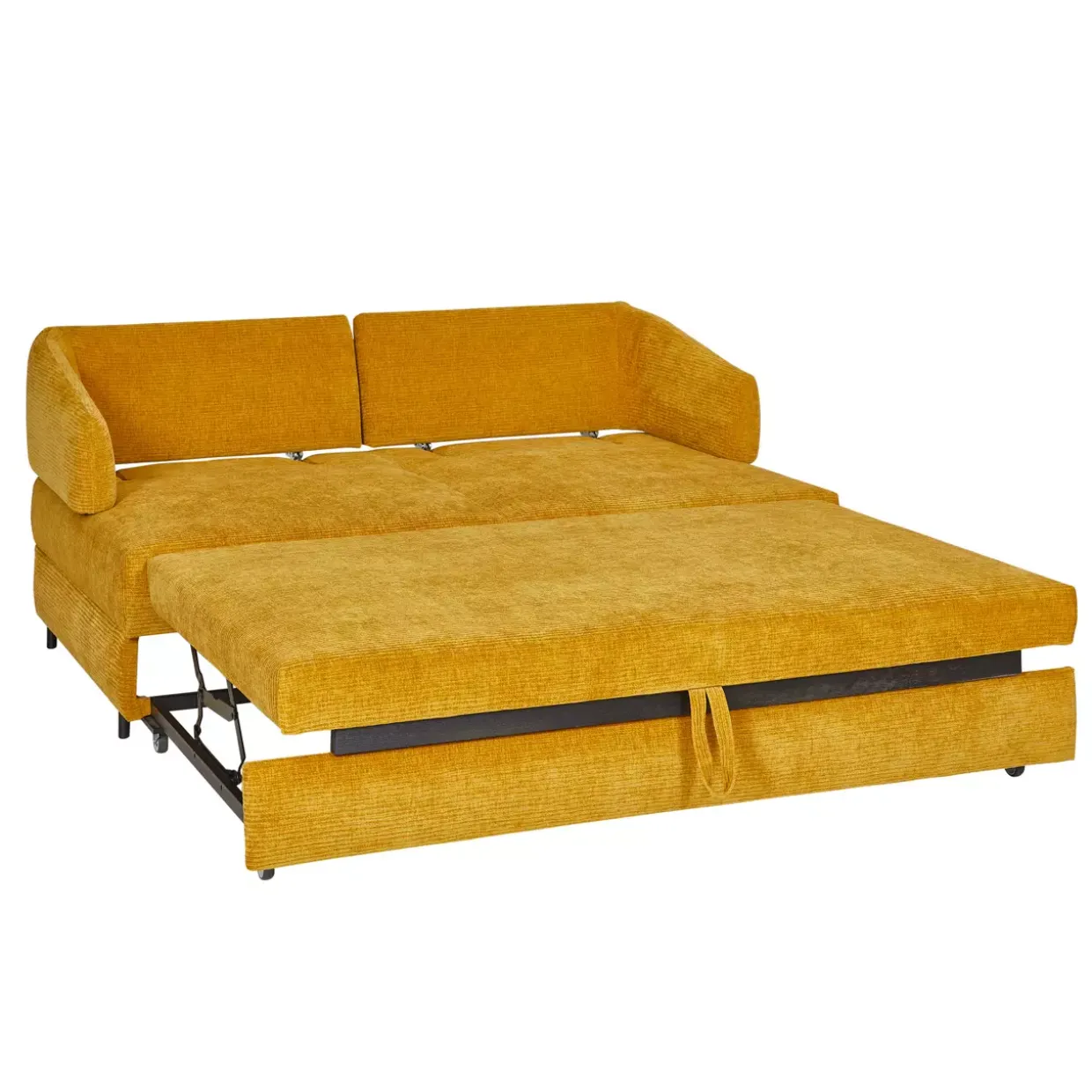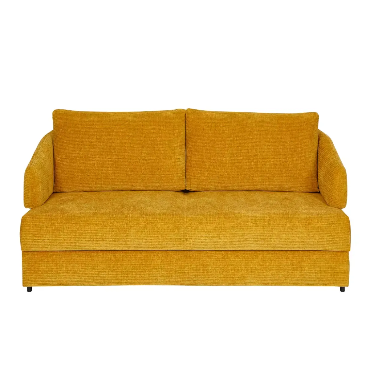 Ein charakteristisches Merkmal des Schlafsofas Emilie ist die leger gestaltete Rückenlehne, die echt bezogen ist und somit eine harmonische Optik aus jedem Blickwinkel bietet. In einem modernen Loft-Stil gestaltet, verbindet dieses Schlafsofa aus Stoff und Metall Funktionalität mit ästhetischem Design. Die Kombination aus gelben und schwarzen Tönen fügt sich nahtlos in diverse Einrichtungsstile ein und sorgt für einen eleganten Akzent im Raum.