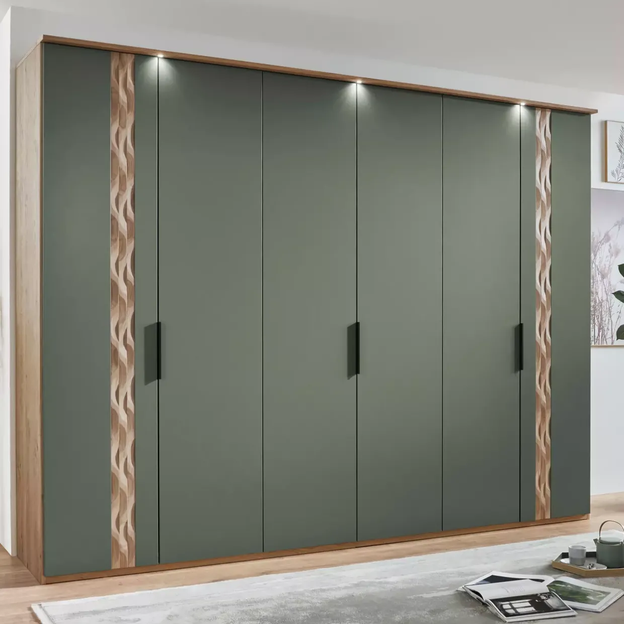 Der elegante Drehtürenschrank mit seinem sechstürigen Design verleiht jedem Schlafzimmer eine moderne Note. Die Außentüren sind kunstvoll mit einem Wellenprofil lackiert und fügen sich harmonisch in die Farbpalette aus Balkeneiche, Jungle Green und Anthrazit ein. Diese zeitgenössische Kombination aus Holz und Holzwerkstoffen sorgt nicht nur für eine stilvolle Optik, sondern auch für Langlebigkeit.