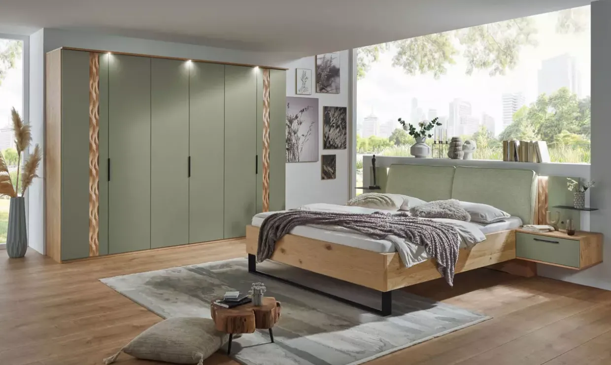 Ein weiteres Highlight ist das luxuriöse Bett mit seinem gepolsterten Kopfteil aus Stoff Senta Jungle Green, das Komfort und Eleganz vereint. Das Fußteil, das mit einer Kufe versehen ist, rundet das Design ab und verleiht dem Raum eine besondere Note. Holz und furnierte Oberflächen tragen maßgeblich zur natürlichen Ausstrahlung des Schlafzimmers bei.