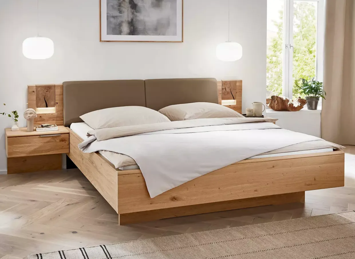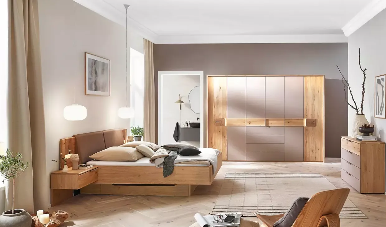 Jedes Detail wurde sorgfältig ausgewählt, um sowohl Ästhetik als auch Funktion zu vereinen. Die Natur als Inspirationsquelle spiegelt sich in der Materialwahl wider, wobei Holz den zentralen Bestandteil bildet. Es strahlt Wärme und Beständigkeit aus, Eigenschaften, die in jedem Element des Schlafzimmers zu spüren sind.