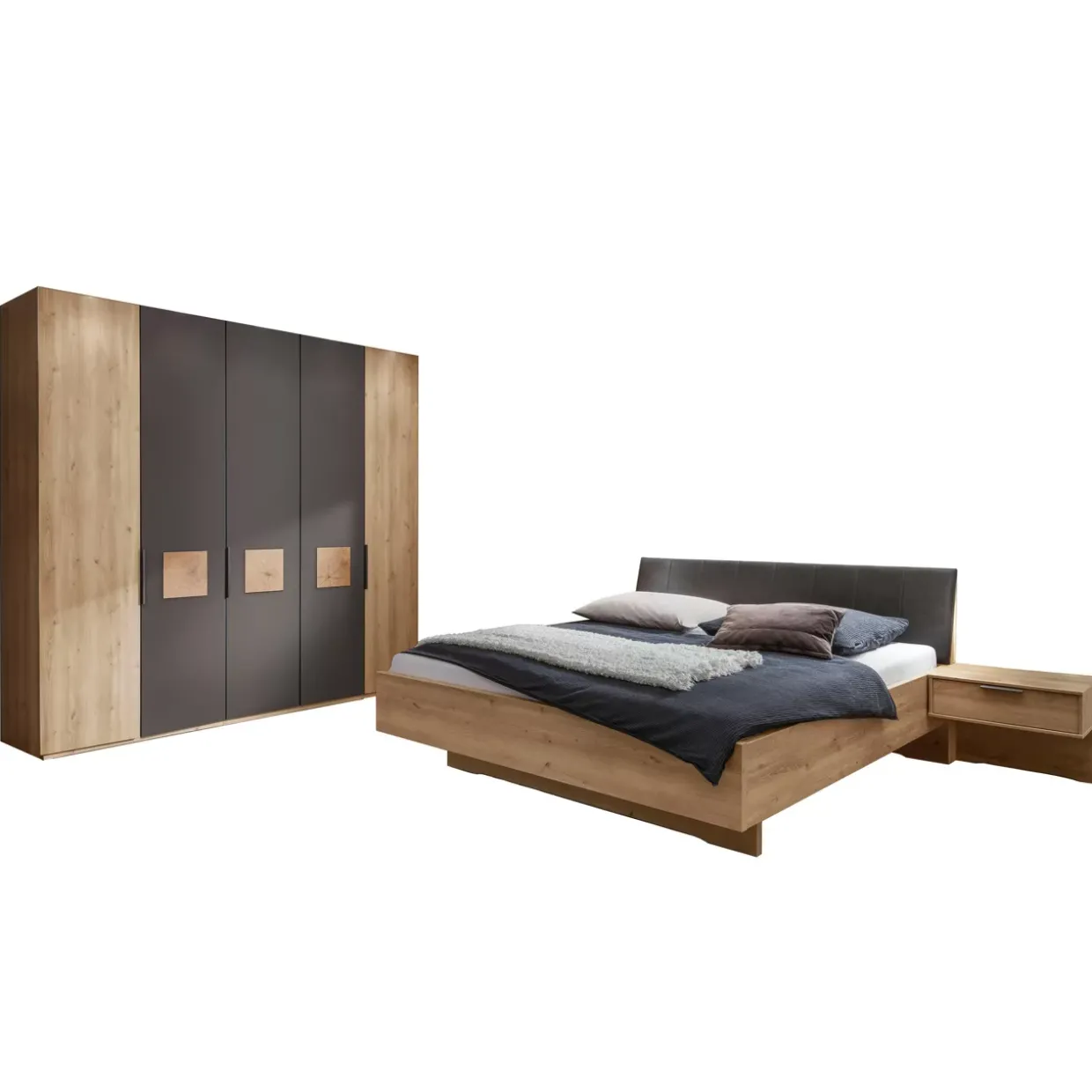 Graphitfarbene Akzente definieren die moderne Almeria Schlafzimmerkombination, die mit einem harmonischen Zusammenspiel von Stil und Funktionalität überzeugt. In der Kombination von Holzwerkstoffen und edlem Leder entfaltet sich ein ästhetisches Gesamtbild, das durch seine schlichte Eleganz besticht.
