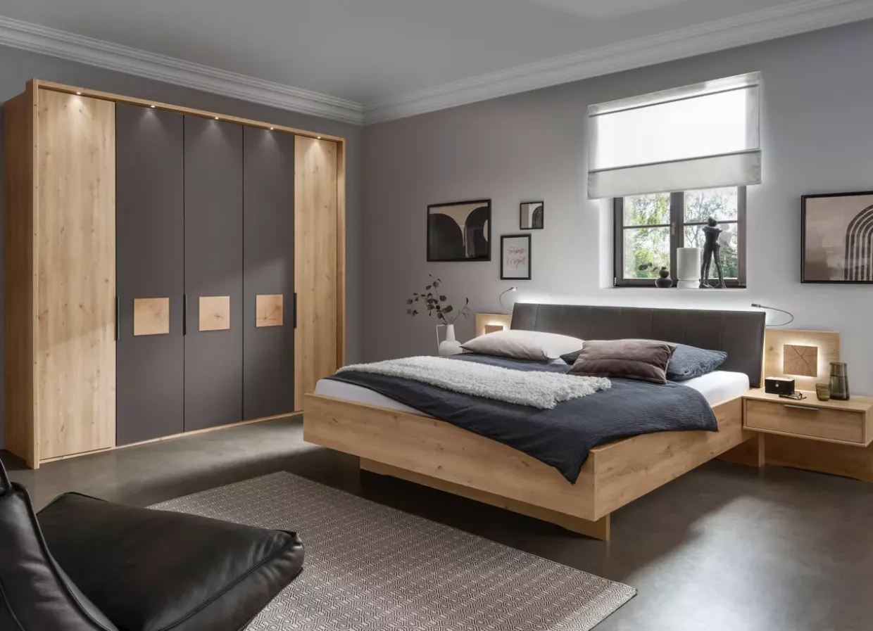 Mit dieser Schlafzimmerkombination wird der Raum zu einem Rückzugsort der Ruhe und des Stils. Die Kombination aus modernen Elementen und natürlichen Materialien schafft eine Umgebung, die sowohl zeitgemäß als auch zeitlos wirkt.