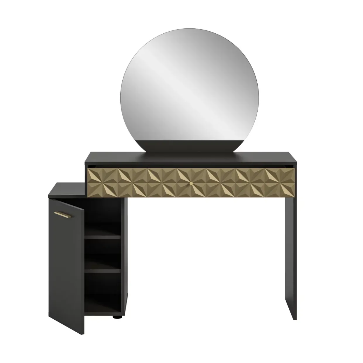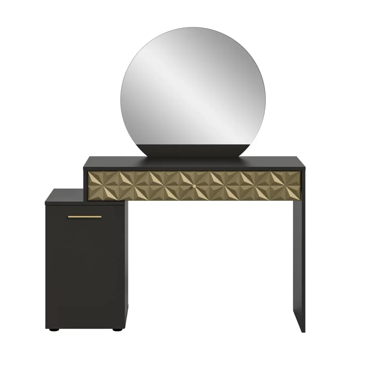 Schwarz Melamin und Gold vereinen sich zu einem stilvollen Zusammenspiel der Eleganz. Ein Schminktisch, der in seiner modernen Gestaltung zeitgemäße Akzente setzt. Die Kombination aus Schwarz und Gold verleiht dem Tisch eine edle Präsenz, die sowohl funktional als auch ästhetisch ansprechend ist.