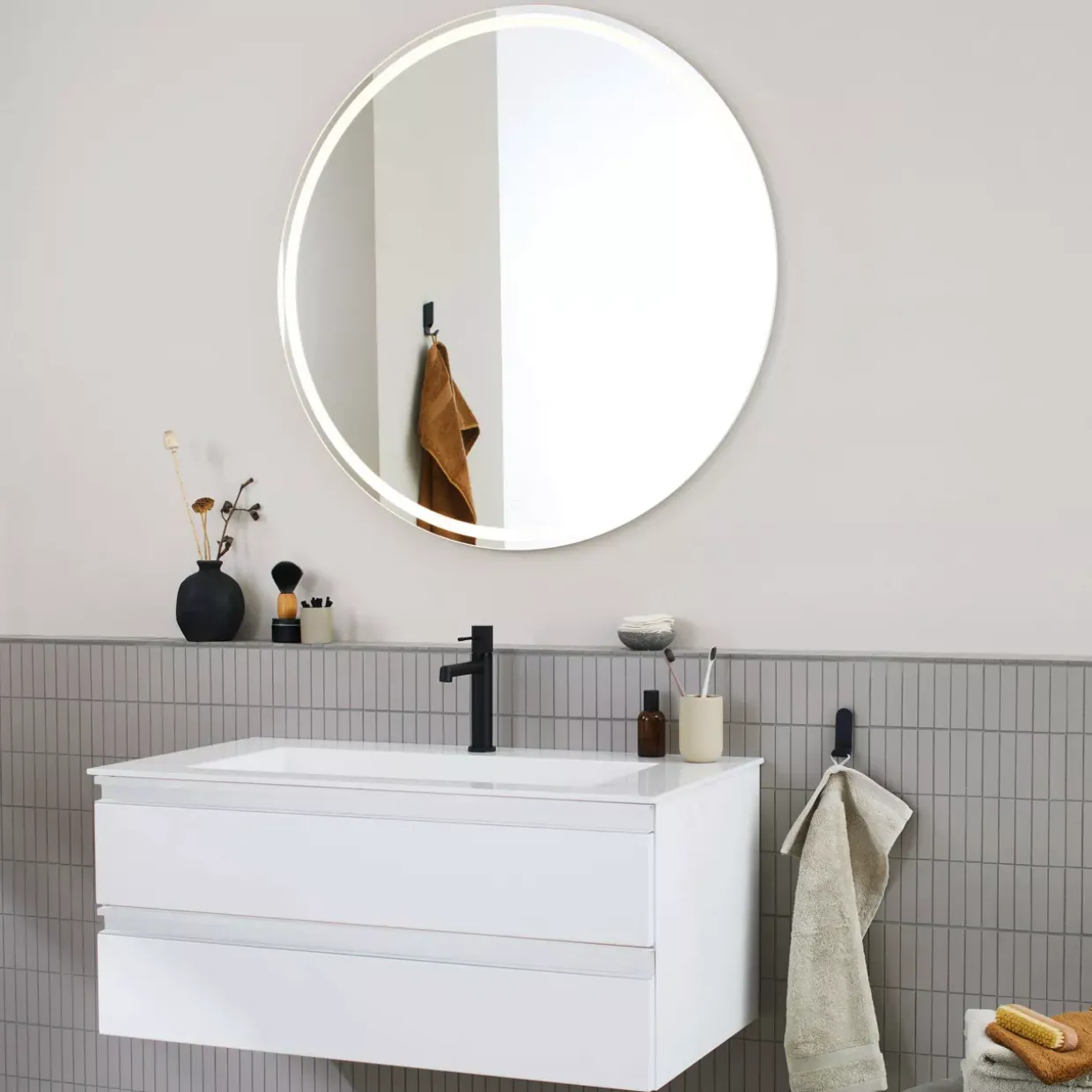 Der Flächenspiegel besticht durch seine runde Form und fügt sich nahtlos in ein modernes Ambiente ein. Ein besonderes Highlight ist die umlaufende LED-Beleuchtung, die für eine gleichmäßige und angenehme Ausleuchtung sorgt. Weiß ist nicht nur die Farbe der Eleganz, sondern auch die des zeitlosen Designs, das sich in jedem Raum harmonisch einfügt.