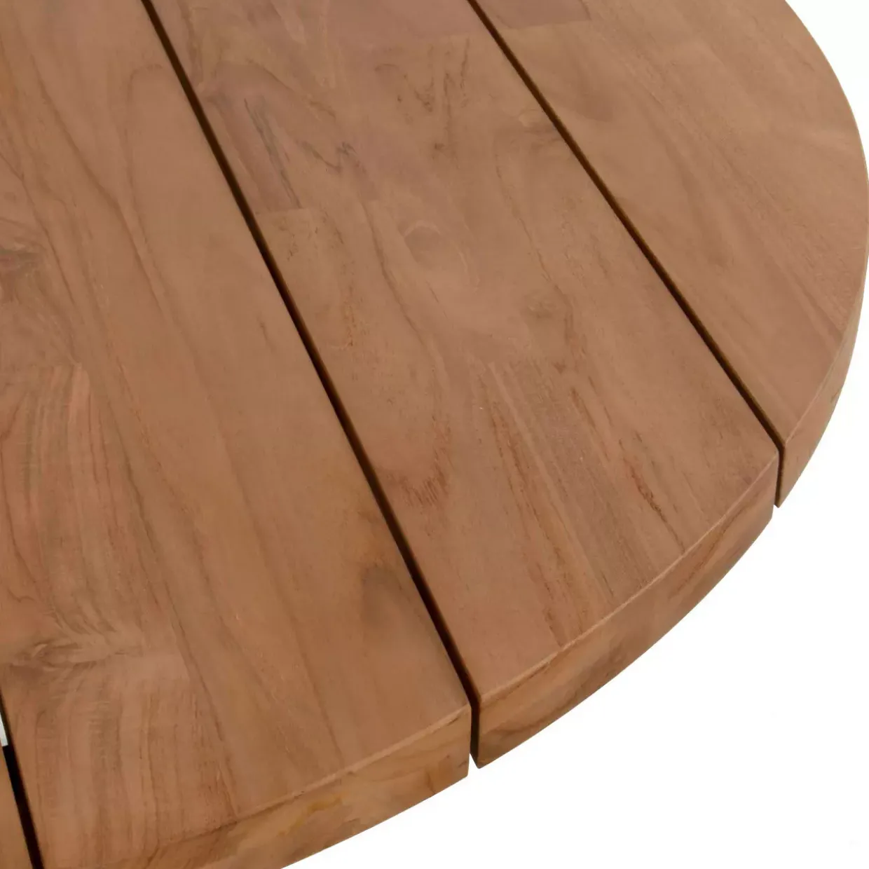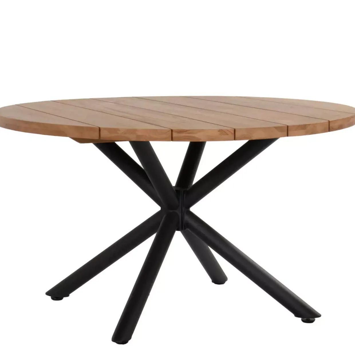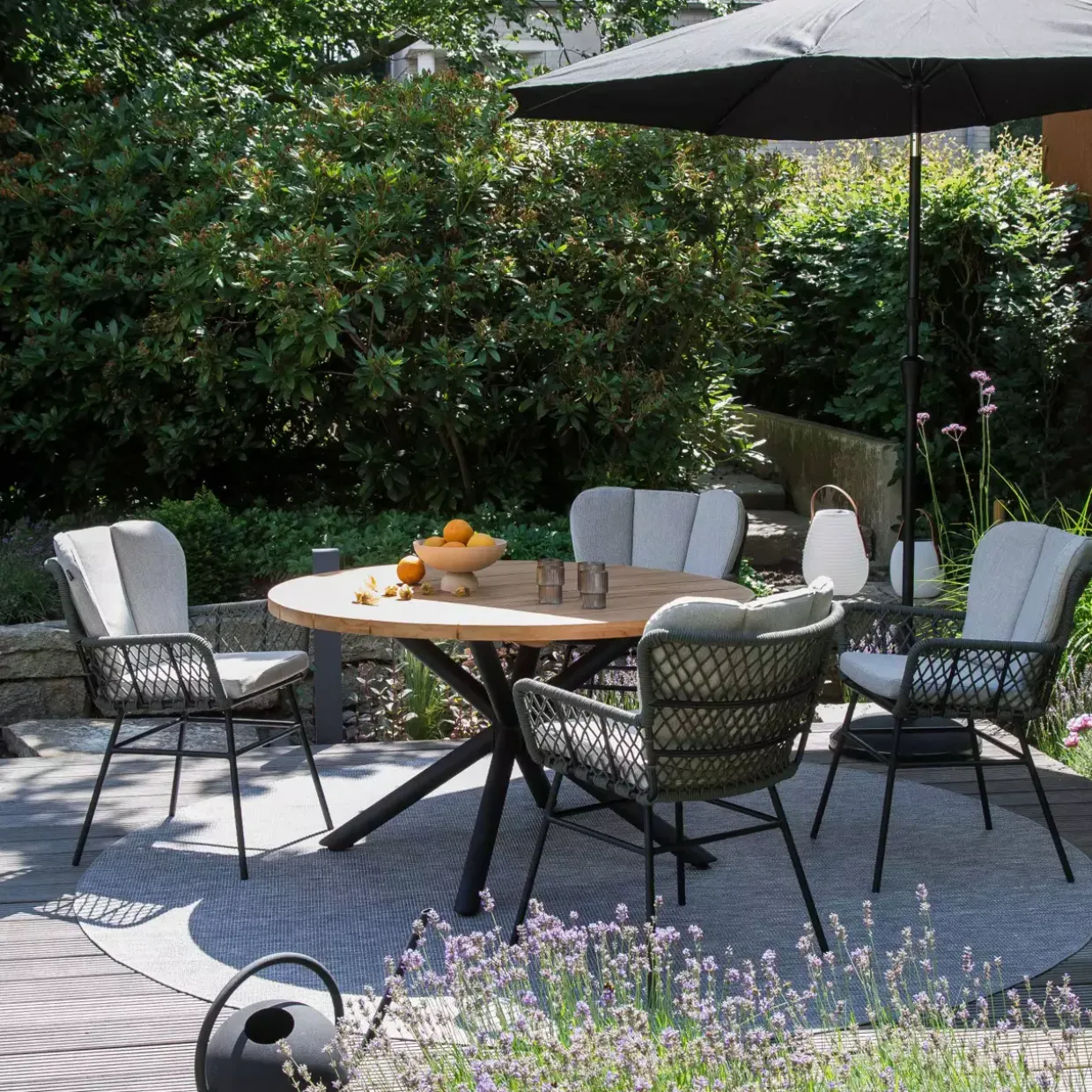 Der Garten als Ruheoase verlangt nach einem stilvollen Mittelpunkt. Der runde Gartentisch im Japandi-Stil vereint die schlichte Eleganz des Nordens mit der warmen Ästhetik des Ostens. Saba, das Modell mit dem besonderen Flair, besticht durch seine Materialwahl. Massives Teakholz, bekannt für seine Langlebigkeit und Widerstandsfähigkeit, bildet die Basis dieses eleganten Möbelstücks.Die charmante Lattenkonstruktion verleiht dem Tisch eine luftige Leichtigkeit, während das robuste 4-Fußgestell aus Aluminium Stabilität und Beständigkeit garantiert. Diese Kombination aus Holz und Metall schafft nicht nur ein harmonisches Gesamtbild, sondern sorgt auch für eine hohe Funktionalität. Der Mix aus natürlichen und modernen Elementen fügt sich nahtlos in jedes Gartenambiente ein.Die Farben Schwarz und Natur unterstreichen die zeitlose Ästhetik des Designs. Damit lässt sich der Tisch mühelos mit verschiedenen Sitzgelegenheiten kombinieren. Ob für ein entspanntes Frühstück im Freien oder ein geselliges Abendessen mit Freunden, der Saba Gartentisch bietet ausreichend Platz und Komfort. Lassen Sie sich von der einzigartigen Verbindung aus Form und Funktion begeistern und genießen Sie entspannte Stunden im Freien.