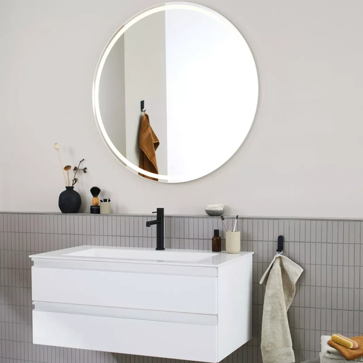 Falls Sie auf der Suche nach einem passenden Spiegel sind, besteht die Möglichkeit, diesen auf Anfrage gegen Mehrpreis zu erwerben. Die folierte Oberfläche des Waschtisches unterstreicht nicht nur die moderne Ästhetik, sondern sorgt auch für eine pflegeleichte Handhabung. Diese Waschtisch-Kombination vereint Funktionalität und Design auf höchstem Niveau und ist eine Bereicherung für jedes stilbewusste Zuhause.