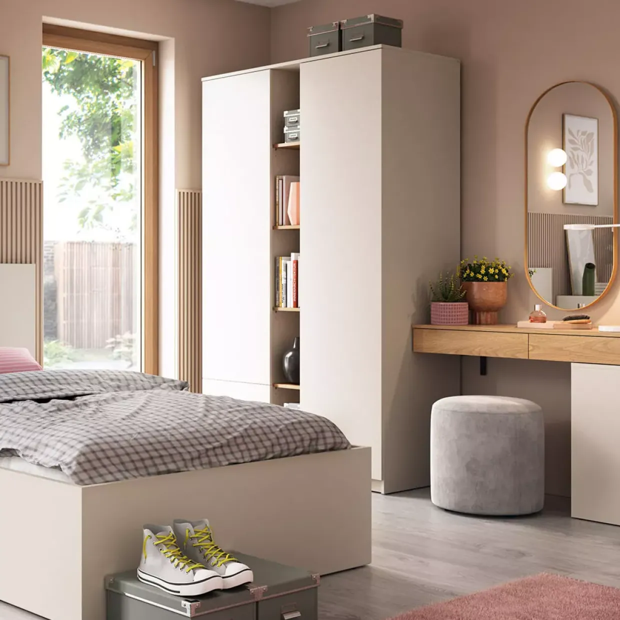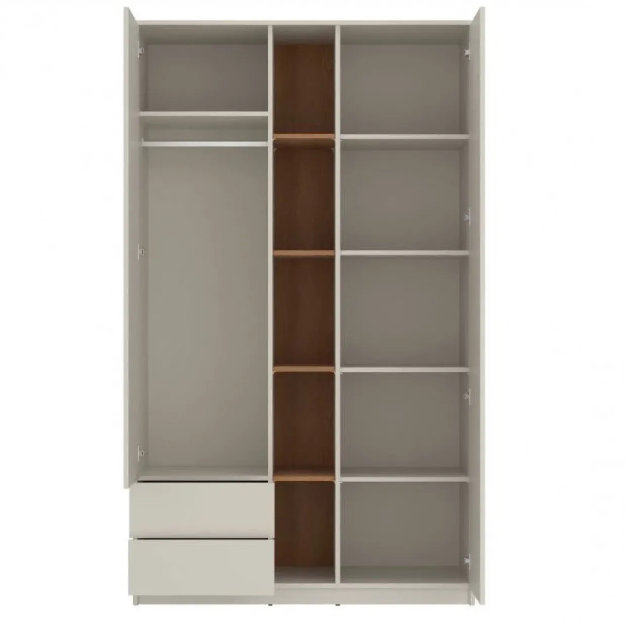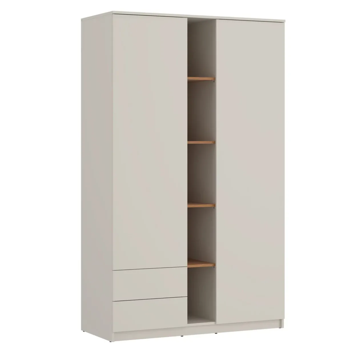 Griffloses System und modernste Technik vereinen sich im Kleiderschrank der Kategorie FANO. Die Kombination aus Eiche Karmel und Kaschmir verleiht diesem Möbelstück eine elegante und zeitgemäße Ästhetik, die sich nahtlos in jedes moderne Interieur einfügt. Der Einsatz von Holzwerkstoff, Metall und Kunststoff bietet eine robuste und langlebige Struktur, die den täglichen Anforderungen mühelos standhält.