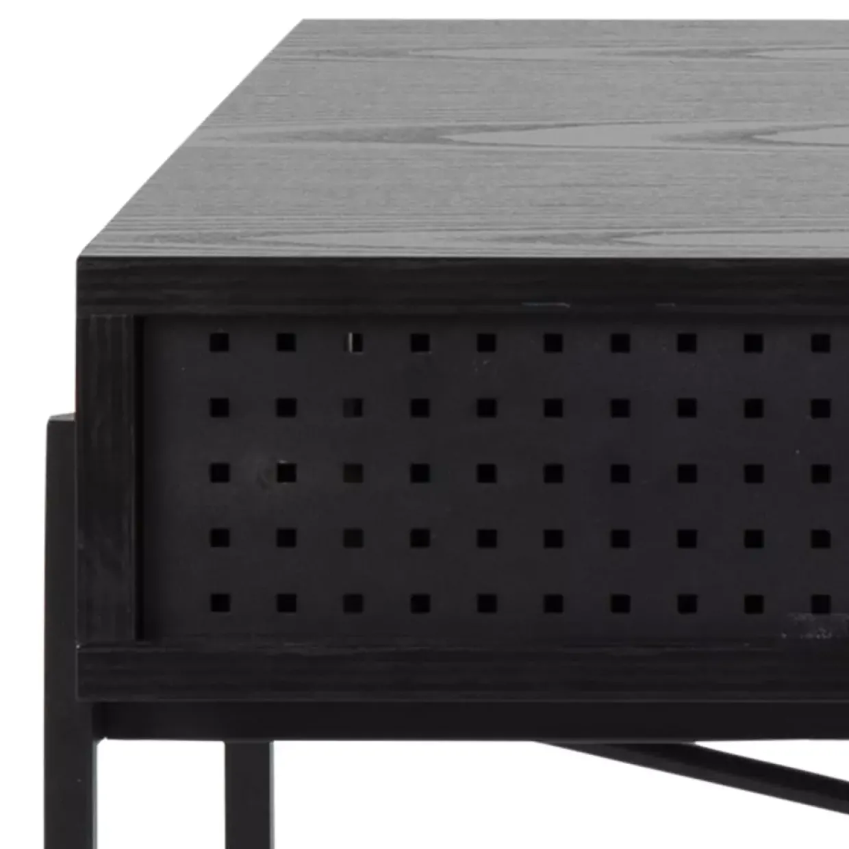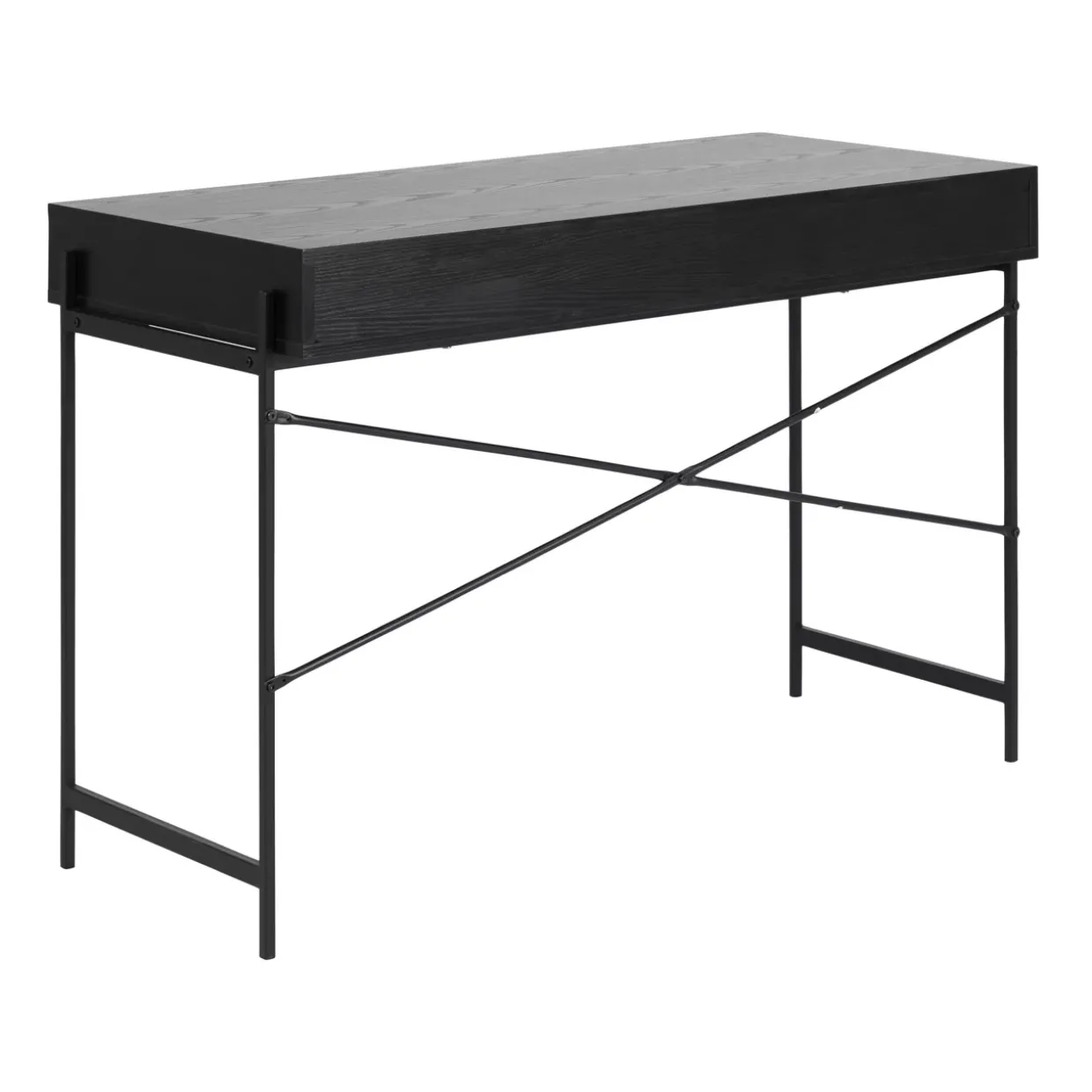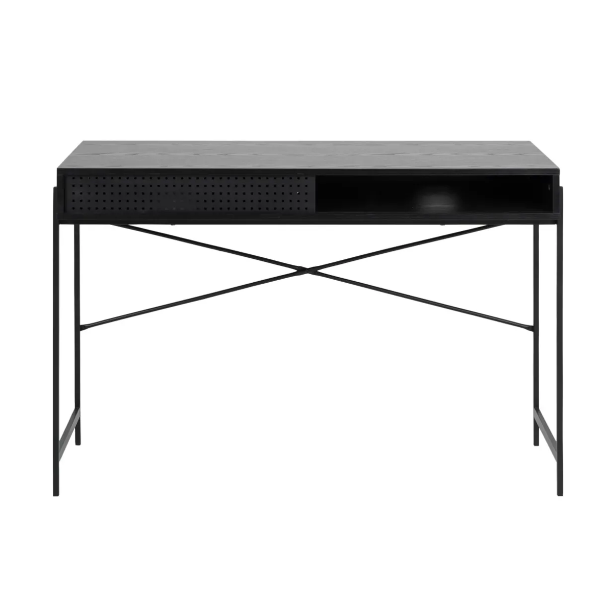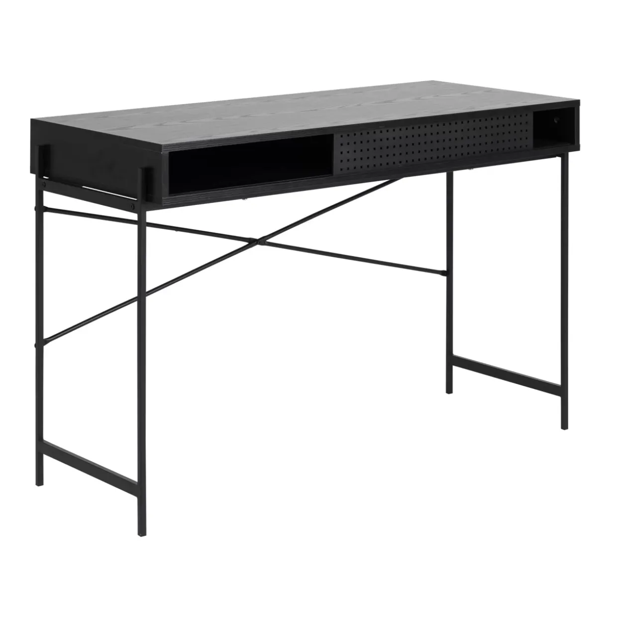 Schwarz und modern präsentiert sich der Angus Schreibtisch in einem elegant-rechteckigen Design, das sowohl in privaten als auch in professionellen Räumen beeindruckt. Die Kombination aus robustem Metall und hochwertigem Holzwerkstoff verleiht dem Möbelstück eine zeitlose Anmutung, die mit ihrer melaminharzbeschichteten Oberfläche für zusätzliche Beständigkeit sorgt.Ein besonderes Highlight ist die Schiebetür aus schwarzem Metall-Mesh, die nicht nur optisch überzeugt, sondern auch funktional ist. Diese Tür verleiht dem Schreibtisch eine gewisse Raffinesse und sorgt für einen aufgeräumten Look, indem sie Stauraum clever verdeckt.Der Angus Schreibtisch fügt sich harmonisch in den modernen Einrichtungsstil ein und bietet dabei Flexibilität und Stil. Funktionalität und Ästhetik gehen Hand in Hand, wenn die Farbtöne von Schwarz und Esche Schwarz miteinander harmonieren und ein stimmiges Gesamtbild schaffen. Für jene, die Wert auf hochwertige Materialien und durchdachtes Design legen, stellt der Angus Schreibtisch eine ideale Wahl dar. Die Kombination aus Form und Funktion wird durch den Einsatz von Metall und Holzwerkstoff perfekt ergänzt, was zu einem langlebigen und pflegeleichten Möbelstück führt. Genießen Sie die elegante und zugleich praktische Gestaltung in Ihrem Arbeitsbereich.