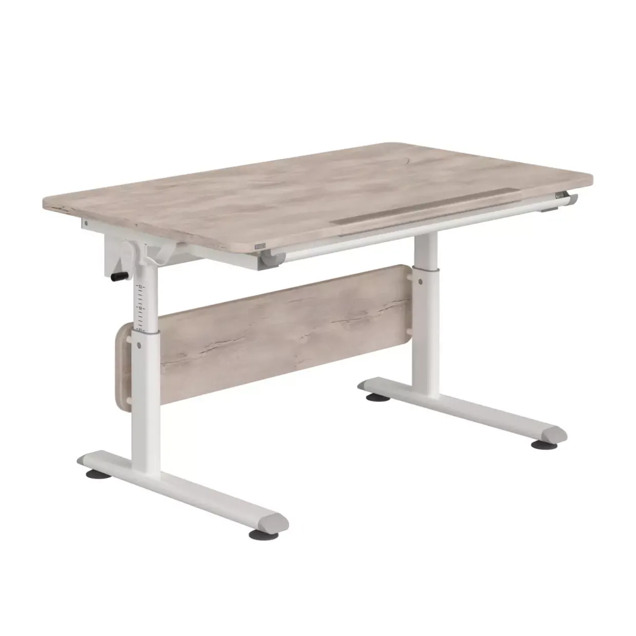 Ein Hauch von Modernität trifft auf Funktionalität: Der Diego Schreibtisch im Modell Schoolworld verbindet einen modernen Stil mit praktischen Features. Das Design in edler Eiche-Nautik-Nachbildung und Weiß sorgt für eine ansprechende Optik, die sich harmonisch in jedes Arbeitszimmer einfügt. Die Schrägstellung der Tischplatte ist ein besonderes Highlight. Dank der 3 Raster-Scheren lässt sich die Platte bis zu 19 Grad neigen, was ergonomisches Arbeiten fördert und den Komfort erhöht.