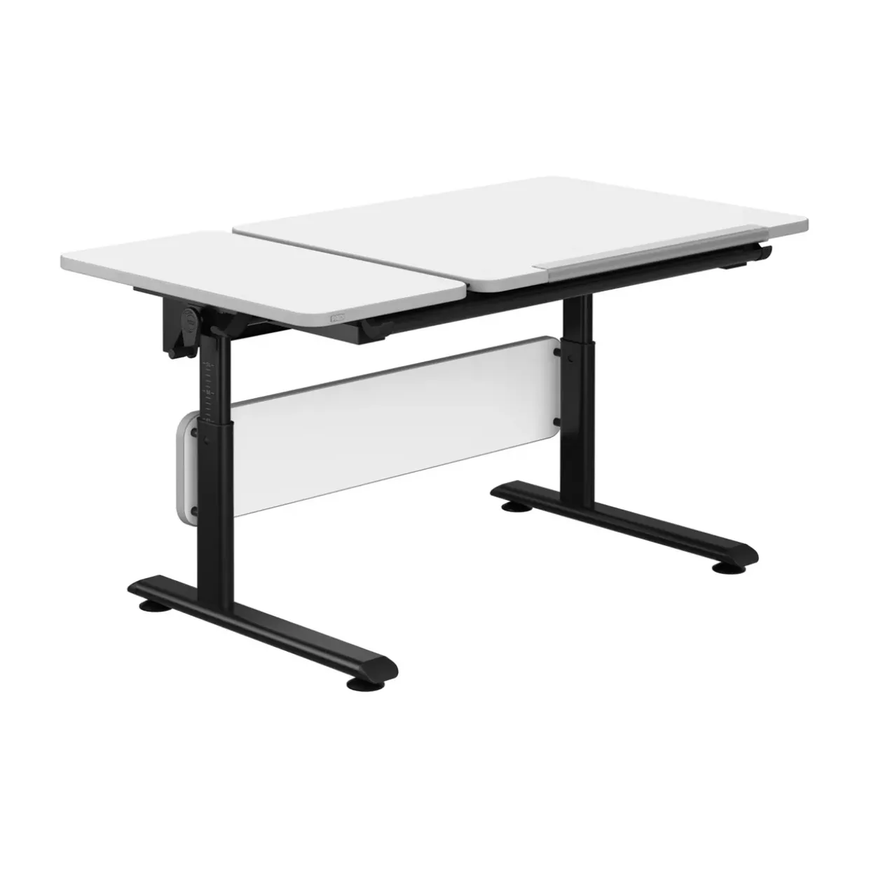 Die funktionale Aufteilung der Schreibtischplatte in eine neigungsfähige Hauptplatte von 90 cm und einen feststehenden Teil von 37,5 cm bietet vielseitige Nutzungsmöglichkeiten. Praktische Ergänzungen wie eine 60 cm Lineal Ablagemulde und ein Taschenhaken erhöhen den Komfort im Arbeitsalltag.