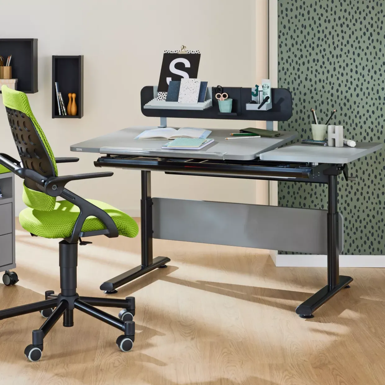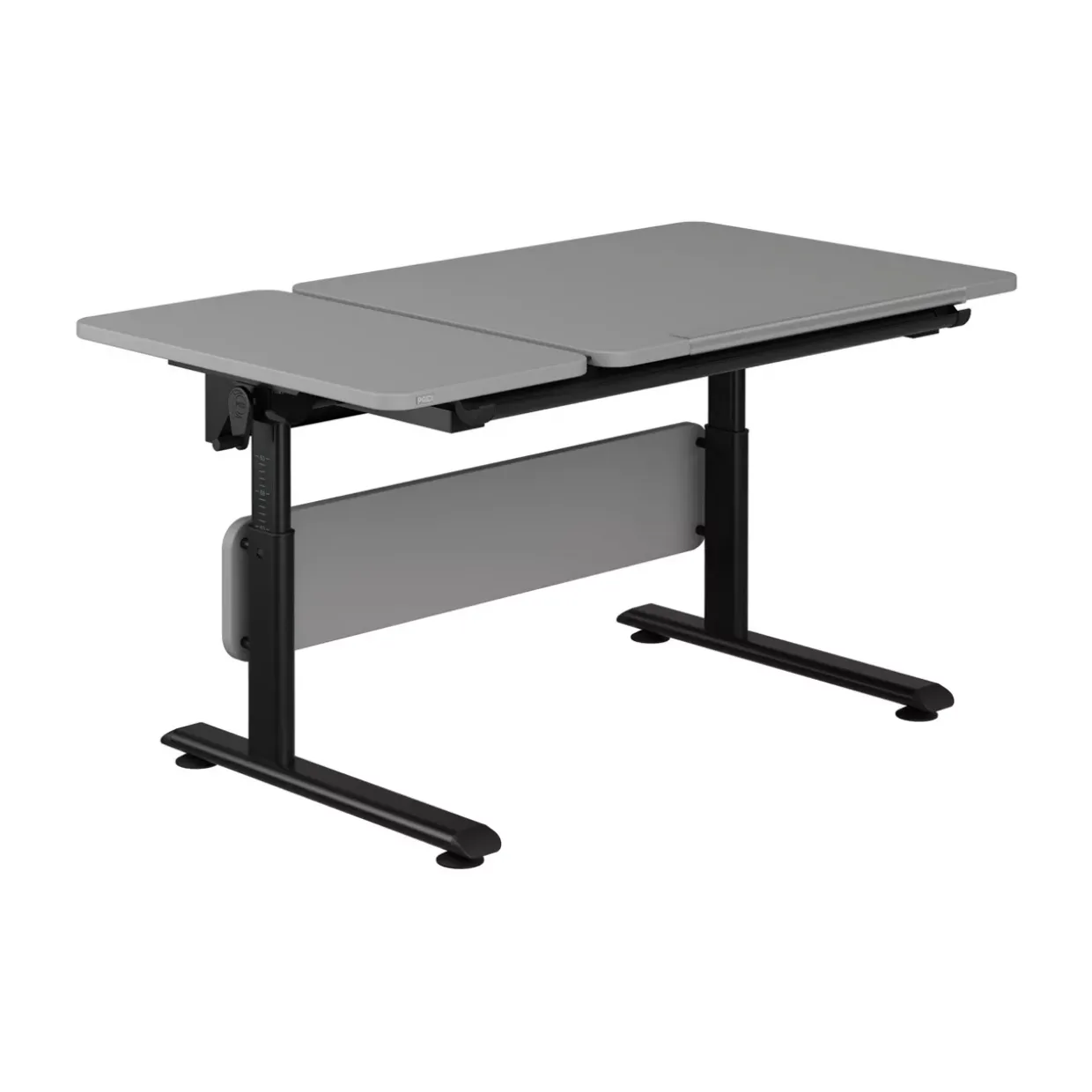 Schreiben und Arbeiten werden durch die durchdachte Aufteilung der Tischplatte erleichtert. Während die Hauptplatte neigbar ist, bleibt ein fester Teil für zusätzliche Materialien unverändert. Zwischen den Platten sorgt eine Streifenbürste aus Polypropylen dafür, dass Stifte und andere kleine Gegenstände nicht herunterfallen. Diese durchdachte Konstruktion wird durch ein 60 cm Lineal und einen praktischen Taschenhaken ergänzt, die zusätzlichen Komfort bieten.
