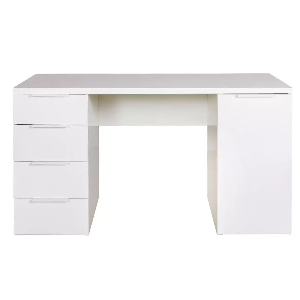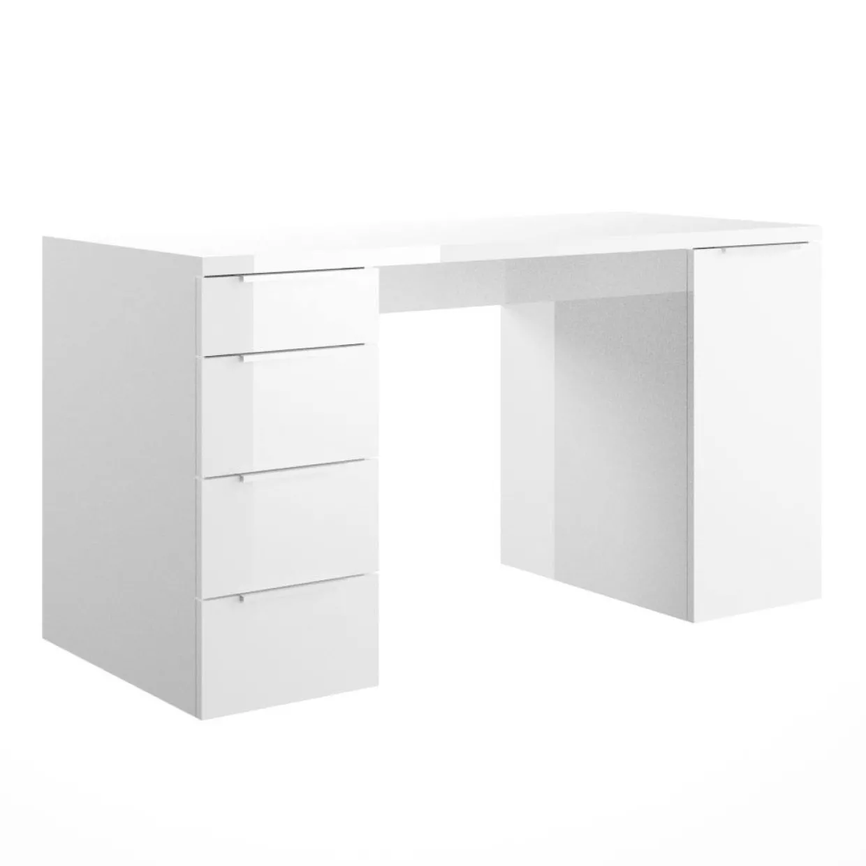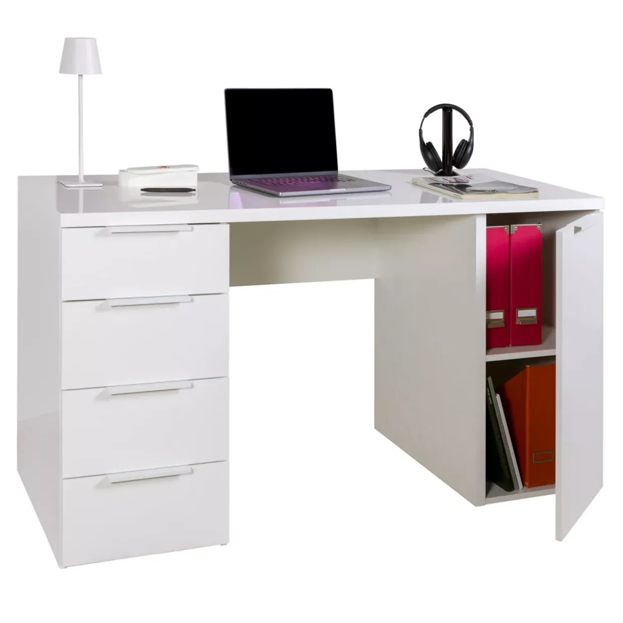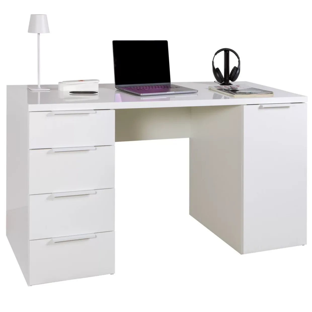 Hochglanz weiß bringt eine elegante Note in jedes Arbeitszimmer. Der Espresso Schreibtisch vereint modernes Design mit praktischer Funktionalität. Gefertigt aus hochwertigem Holzwerkstoff und Metall, verspricht er Langlebigkeit und Stabilität. Die melaminharzbeschichtete Oberfläche sorgt für eine pflegeleichte und widerstandsfähige Nutzung, die den Alltag bereichert.Eine clevere Kombination aus Stauraum und Stil bietet die Ausstattung mit einer Tür und vier Schubladen. Diese ermöglichen eine geordnete Unterbringung von Dokumenten und Büromaterialien. So bleibt der Arbeitsplatz jederzeit aufgeräumt und übersichtlich. Das zeitgemäße Design fügt sich nahtlos in verschiedene Einrichtungsstile ein und harmoniert besonders gut mit modernen Wohnkonzepten.Für all jene, die Wert auf klare Linien und eine strukturierte Arbeitsumgebung legen, stellt dieser Schreibtisch eine exzellente Wahl dar. Die helle Farbgebung wirkt freundlich und einladend, wodurch der Raum optisch vergrößert wird. Gleichzeitig bietet der Schreibtisch ausreichend Platz für Computer, Unterlagen und persönliche Gegenstände, was eine effiziente Arbeitsweise unterstützt.Mit dem Espresso Schreibtisch wird der Arbeitsbereich zu einem Ort, an dem sich Produktivität und Ästhetik harmonisch verbinden. Qualität und Design gehen hier Hand in Hand, um den hohen Ansprüchen des modernen Lebens gerecht zu werden.