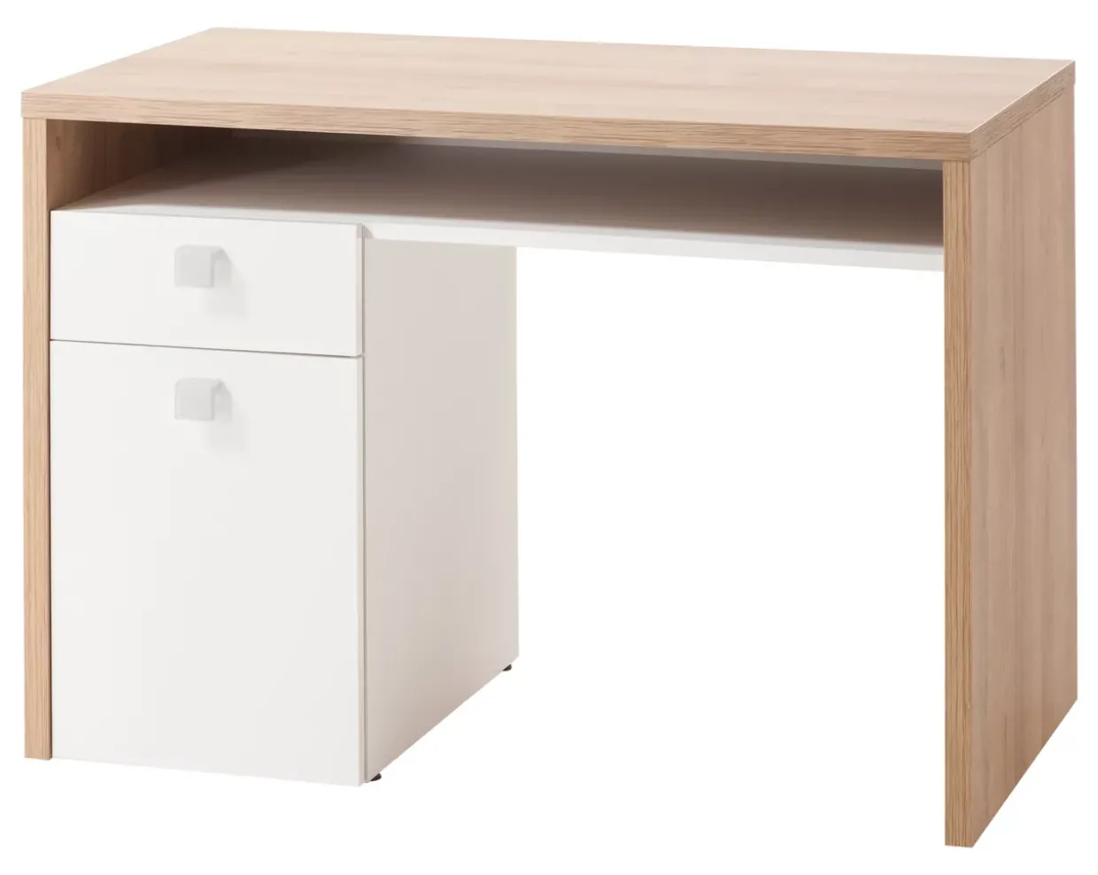 Mit einer harmonischen Farbgebung in Eiche Riviera und Weiß Hochglanz fügt sich dieser Schreibtisch stilvoll in verschiedenste Raumkonzepte ein. Der Einsatz von Drehtüren bietet eine unkomplizierte und praktische Lösung für die Aufbewahrung. Die Kombination aus einer Tür und einer Schublade ermöglicht einen organisierten Arbeitsplatz und bietet ausreichend Stauraum für Ihre Unterlagen und Büromaterialien.