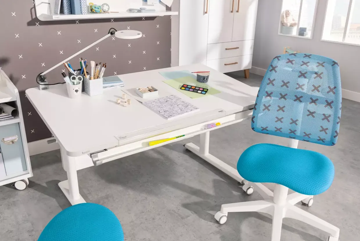 Einstellbare Sitzhöhe, die sich speziell an die Bedürfnisse von Kindern anpasst, bietet der moderne Schreibtischstuhl Schoolworld. Diese bemerkenswerte Funktion wird durch eine eigens entwickelte Gasdruckfeder ermöglicht und sorgt für optimalen Sitzkomfort. Der Stuhl überzeugt durch seine elegante Farbkombination aus Azurblau und Weiß, die jeden Raum stilvoll ergänzt.Ein weiteres Highlight ist die verstellbare Sitztiefe, die sich leicht mit einem Inbus-Schlüssel unter der Sitzfläche fixieren lässt. Diese Flexibilität gewährleistet, dass der Stuhl mit Ihrem Kind mitwächst und sich an verschiedene Körpergrößen anpassen lässt. Die atmungsaktive Rückenlehne bietet zusätzlichen Komfort und unterstützt eine gesunde Sitzhaltung.Sicherheitsdoppelrollen, die lastabhängig gebremst sind, garantieren Stabilität auf sowohl weichen als auch harten Böden. Dies verleiht dem Stuhl nicht nur Mobilität, sondern auch Sicherheit, egal wo er eingesetzt wird. Dank des praktischen Push-Button-Systems lässt sich die Rückenlehne mühelos verstellen, um individuellen Komfort zu bieten. Das verwendete Material, hochwertiger Polyesterstoff, sorgt für Langlebigkeit und einfache Pflege. Die Kombination aus Funktionalität und modernem Design macht diesen Schreibtischstuhl zu einem idealen Begleiter für Kinder und Jugendliche im schulischen Umfeld.