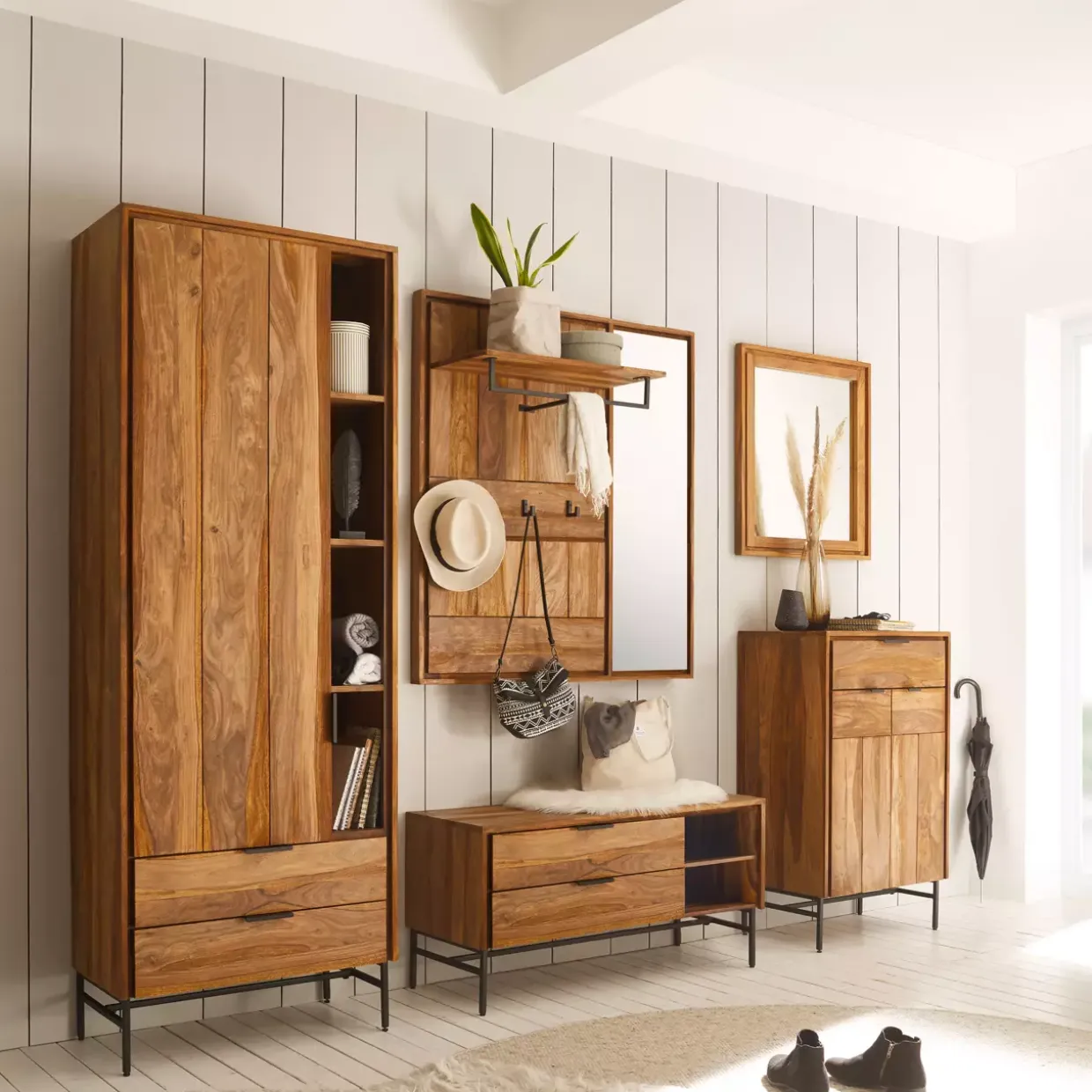 Ein Hauch von Sheesham und Anthrazit verleiht der Schuhbank Shiva einen zeitlosen Charme, der sich nahtlos in jede konventionelle Einrichtung einfügt. Die Kombination aus Holz und Metall sorgt nicht nur für Robustheit, sondern auch für eine elegante Ästhetik. Das 4-Fußgestell bietet Stabilität und verleiht dem Möbelstück einen festen Stand, während die sorgfältige Verarbeitung der Materialien Langlebigkeit garantiert.Besondere Aufmerksamkeit verdient der Einsatz von Türdämpfern, die für ein sanftes und geräuschloses Schließen der Türen sorgen. Dies erhöht nicht nur den Bedienkomfort, sondern schützt auch die Materialien vor unnötiger Abnutzung. Das Modell Shiva überzeugt durch seine stilvolle Erscheinung und die durchdachte Funktionalität, die es zu einem wertvollen Bestandteil Ihrer Einrichtung macht.Das natürliche Finish in Sheesham Honig braun gewachst unterstreicht die warme Ausstrahlung und bringt die Maserung des Holzes besonders gut zur Geltung. Die Schuhbank bietet nicht nur praktischen Stauraum, sondern trägt auch zur Ordnung und Übersichtlichkeit in Ihrem Zuhause bei. Ob im Eingangsbereich oder im Flur platziert, sie ist ein unverzichtbares Möbelstück für alle, die Wert auf Qualität und Stil legen.