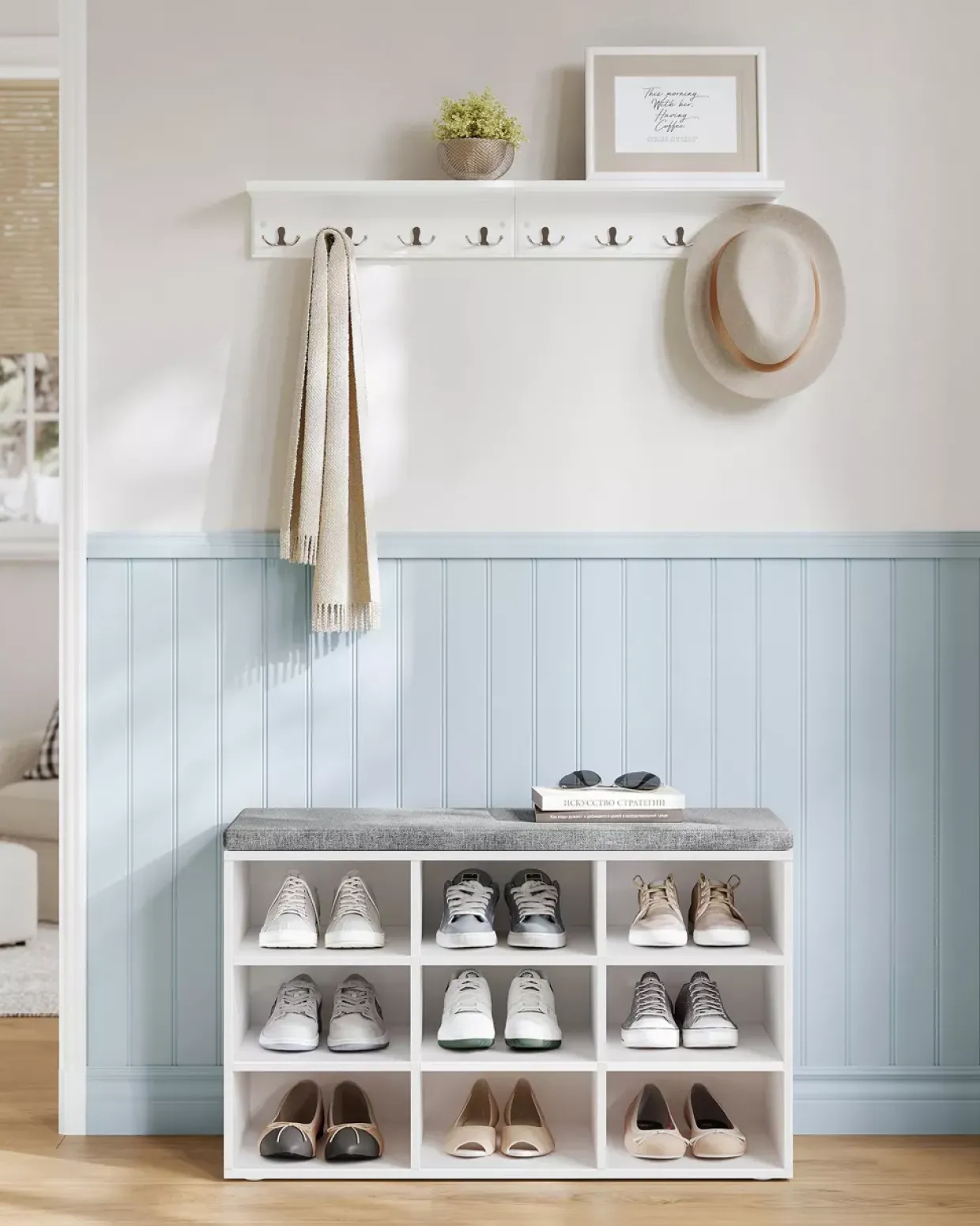 In der Welt der stilvollen Einrichtungen zieht der Cottage-Stil mit seiner charmanten Einfachheit alle Blicke auf sich. Die Schuhbank, ein wahres Schmuckstück in dieser Kategorie, überzeugt durch ihre harmonische Kombination aus Weiß und Grau. Diese Farbgebung verleiht jedem Eingangsbereich eine beruhigende und einladende Atmosphäre.Der Einsatz von hochwertigen Materialien wie Holzwerkstoff und Stoff sorgt für eine langlebige und robuste Konstruktion, die den täglichen Herausforderungen des Lebens standhält. Diese Materialien bieten zudem eine sanfte Haptik, die das Wohlgefühl beim Benutzen unterstreicht.Ein weiterer Pluspunkt dieser Schuhbank ist ihre Funktionalität. Sie bietet nicht nur ausreichend Stauraum für Ihre Schuhe, sondern auch eine bequeme Sitzgelegenheit beim Anziehen. Diese durchdachte Kombination aus Sitzfläche und Stauraum passt sich mühelos jedem Bedarf an.Die Schuhbank fügt sich nahtlos in verschiedene Einrichtungsstile ein und kann sowohl in modernen als auch in traditionellen Umgebungen harmonisch integriert werden. Das klassische Design in Verbindung mit der dezenten Farbpalette macht sie zu einem zeitlosen Begleiter.Durch die Wahl dieser Schuhbank setzen Sie auf Qualität und Stil, die Ihren Eingangsbereich aufwerten und gleichzeitig eine funktionale Lösung für die Schuhaufbewahrung bieten.