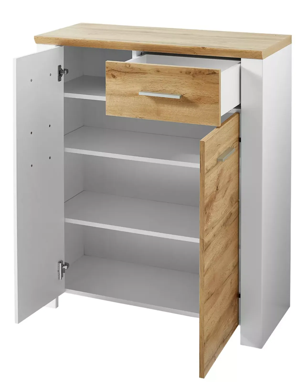 Der Schuhschrank Materio besticht durch seine moderne Eleganz. In einem harmonischen Zusammenspiel aus weiß, braun, Eiche und Holz sowie mattiertem Chrom fügt er sich nahtlos in jede zeitgemäße Einrichtung ein. Zwei Holztüren und ein praktischer Schubkasten bieten ausreichend Stauraum für Ihre Schuhsammlung.