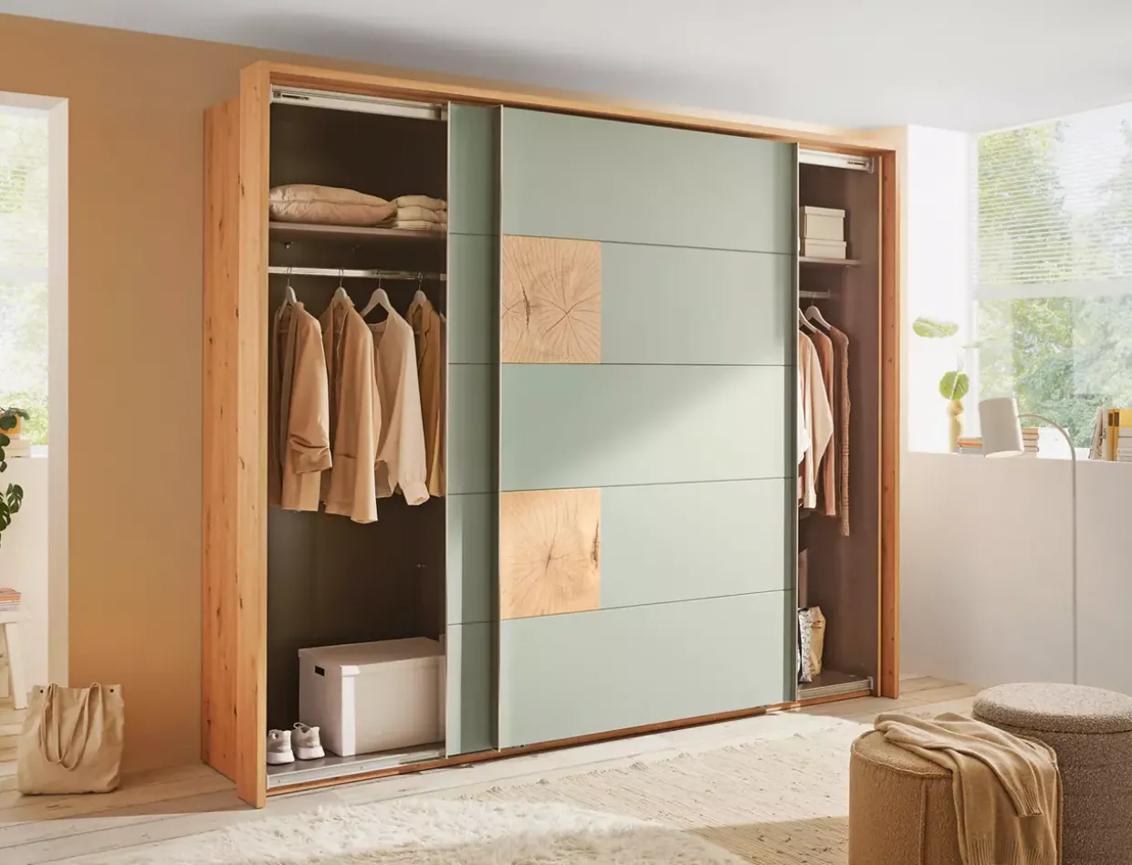 Artisan Eiche verleiht dem Schwebetürenschrank einen Hauch von natürlichem Charme und Eleganz. Dieser Schrank verbindet Funktionalität mit ästhetischem Design und passt sich dank seiner dezenten Farbgebung in Salbei harmonisch in unterschiedliche Raumkonzepte ein.
