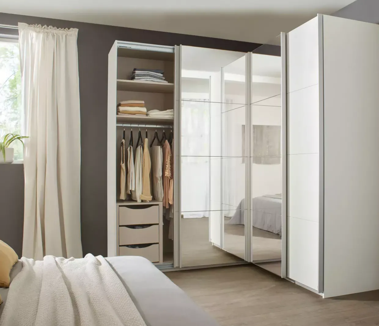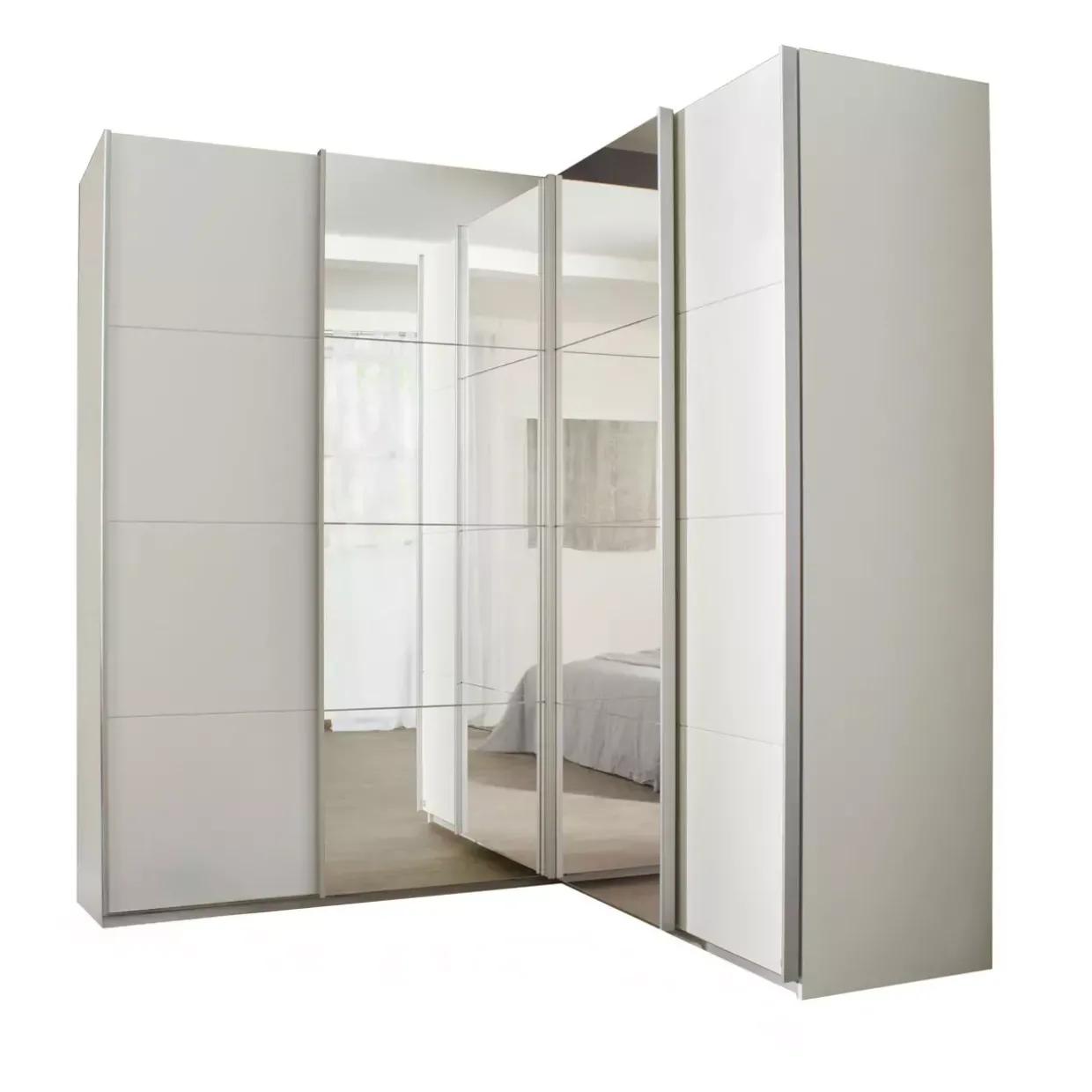 Alpinweißes Dekor prägt das elegante Erscheinungsbild des modernen Schwebetüreneckschranks. Diese stilvolle Kombination aus Glas, Holzwerkstoff und Metall verleiht Ihrem Raum eine harmonische Atmosphäre. Die vier Schwebetüren, zwei davon mit Spiegelglas, bieten nicht nur eine praktische Funktionalität, sondern auch eine optische Raumvergrößerung.