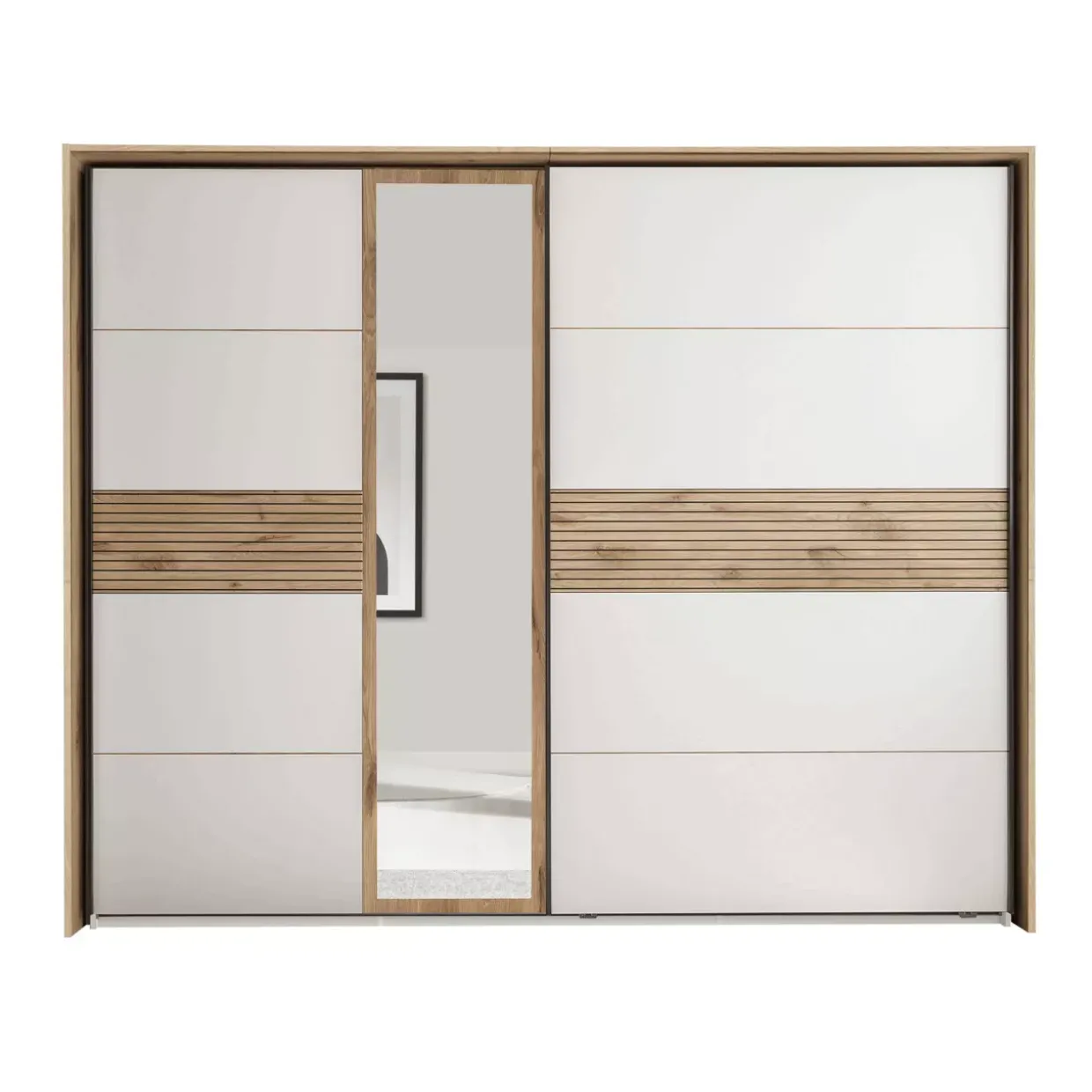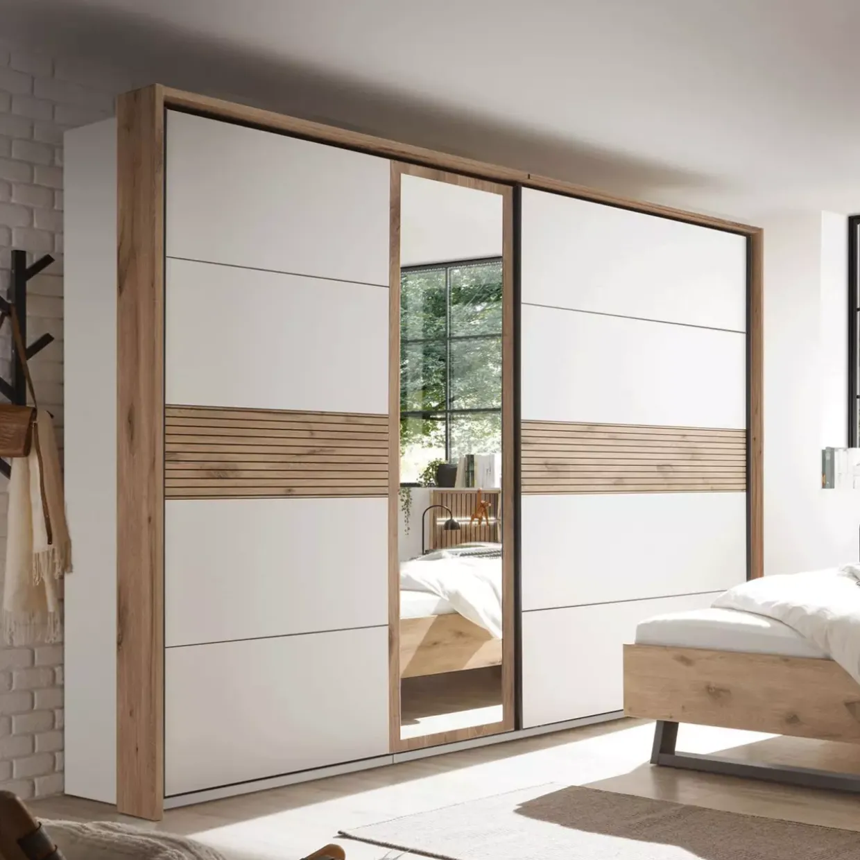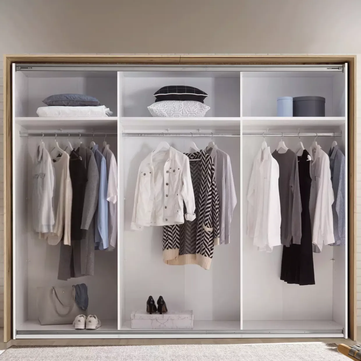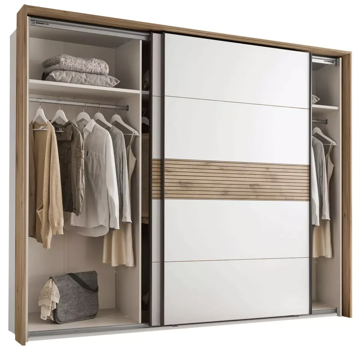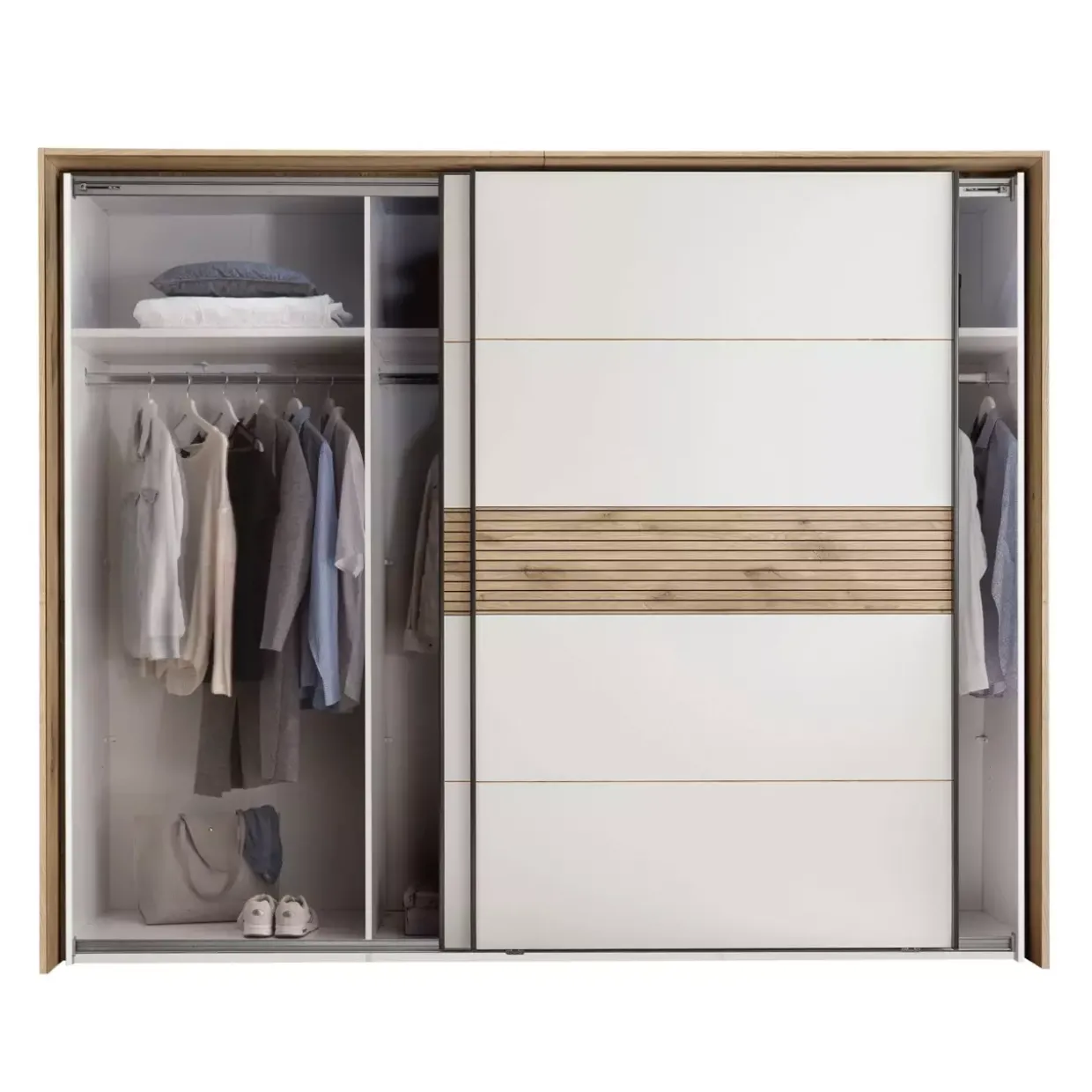 Vielseitigkeit im Inneren ermöglicht eine flexible Organisation Ihrer Kleidung und Accessoires. Durchdachte Aufteilung und ausreichend Stauraum machen den Schwebetürenschrank zu einem praktischen Begleiter im Alltag. Sein durchdachtes Design und die hohe Funktionalität bieten eine hervorragende Lösung für die Aufbewahrung, während die elegante Optik für eine angenehme Wohnatmosphäre sorgt.