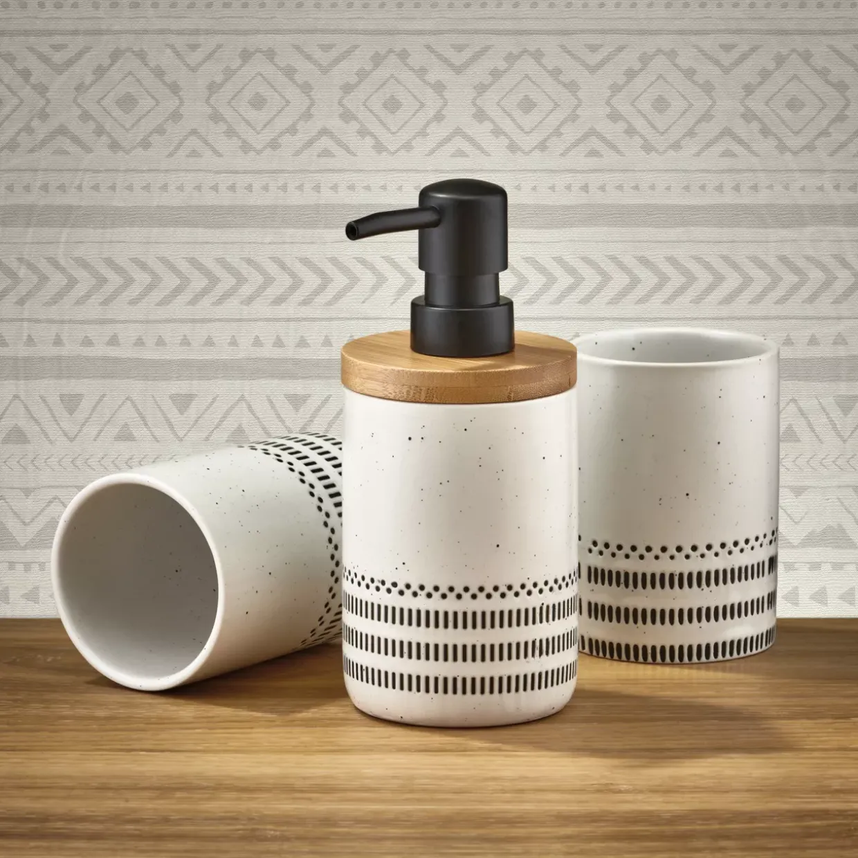 Zahnputzbecher, Alva, Schwarz Weiß;; Alva;ZAHNPUTZBECHER; Bezeichnung2; ZAHNPUTZBECHERDer Zahnputzbecher Alva präsentiert sich in einem modernen Stil, der sowohl funktional als auch ästhetisch ansprechend ist. Schwarz und Weiß kombiniert in einem klaren Design verleihen Ihrem Badezimmer eine zeitlose Eleganz. Bambus, ein nachhaltiges Material, wird hier kunstvoll integriert, um einen natürlichen Akzent zu setzen. Steinzeug, die gewählte Keramikart, sorgt für Langlebigkeit und eine angenehme Haptik. Robust und dennoch stilvoll, so lässt sich das Material beschreiben, das jedem Badezimmer eine besondere Note verleiht. Mit einem Durchmesser von 8 cm bietet der Zahnputzbecher ausreichend Platz für Zahnbürsten und andere Utensilien, ohne dabei klobig zu wirken. Die Kombination aus Bambus und Steinzeug schafft eine harmonische Verbindung von Natur und Moderne. Wer nach einem Zahnputzbecher sucht, der sowohl praktisch als auch optisch ansprechend ist, trifft mit diesem Modell eine ausgezeichnete Wahl. Ein weiteres Highlight ist die sorgfältige Verarbeitung, die hohe Qualität und Langlebigkeit verspricht. Durch die klare Formensprache fügt sich der Zahnputzbecher Alva nahtlos in jedes Badezimmer-Interieur ein, ohne aufdringlich zu wirken. Lassen Sie sich von der schlichten Eleganz und der durchdachten Materialwahl inspirieren, die Ihrem Badezimmer das gewisse Etwas verleiht und gleichzeitig Funktionalität bietet.