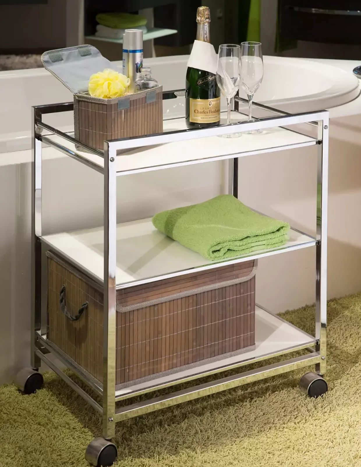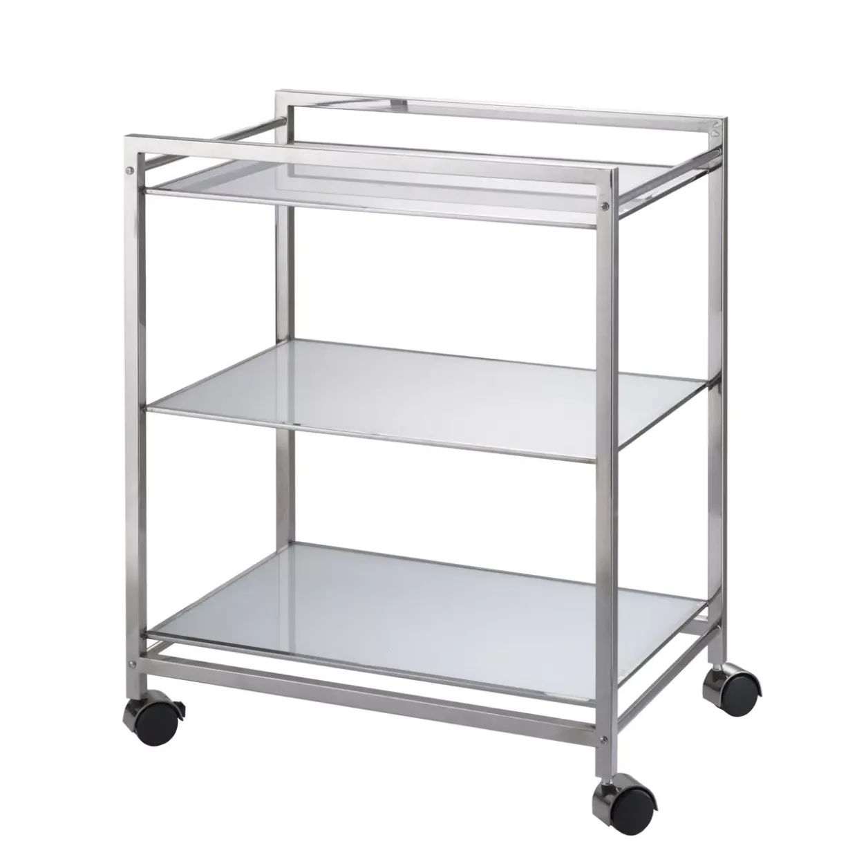 Mit einem Hauch von Retro-Charme zieht dieser stilvolle Servierwagen alle Blicke auf sich. Die pure Eleganz des weißen, hinterlackierten Glases verleiht jedem Raum eine besondere Note. Drei dieser einzigartigen Stücke könnten Ihren Wohnbereich bereichern und als funktionale wie auch dekorative Elemente dienen.Der Rahmen aus hochwertigem Aluminium sorgt für Stabilität und Leichtigkeit zugleich. Dies macht den Servierwagen nicht nur zu einem ästhetischen Highlight, sondern auch zu einem praktischen Helfer im Alltag. Sei es beim Servieren von Getränken oder als stilvolles Regal für Ihre Lieblingsaccessoires – die Einsatzmöglichkeiten sind vielfältig.Das raffinierte Design verbindet Retro-Elemente mit moderner Funktionalität und passt sich mühelos in verschiedene Einrichtungsstile ein. Durch die hinterlackierte Glasoberfläche wird nicht nur ein glänzender Akzent gesetzt, sondern auch eine einfache Reinigung ermöglicht.Für Liebhaber des Retro-Stils bietet dieser Servierwagen eine ideale Kombination aus Form und Funktion. Er wird nicht nur zum praktischen Helfer, sondern auch zum Gesprächsstoff bei Ihren Gästen. Lassen Sie sich von der Kombination aus edler Optik und praktischer Anwendung inspirieren und verschönern Sie Ihr Zuhause mit diesem besonderen Möbelstück.