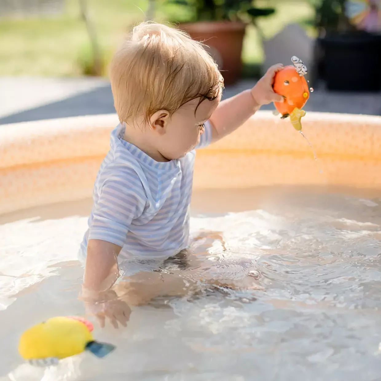 Die Kombination aus Fisch und Krabbe bietet vielseitige Spielmöglichkeiten und fördert die Fantasie der Kinder. Durch das weiche Textilmaterial sind die Spritztiere besonders angenehm zu greifen und zu drücken, was die Feinmotorik unterstützt. Ein weiterer Vorteil ist die einfache Pflege: Bei Bedarf können die Spritztiere in der Maschine bis zu 40 Grad Celsius schonend gewaschen werden, sodass sie schnell wieder einsatzbereit sind.