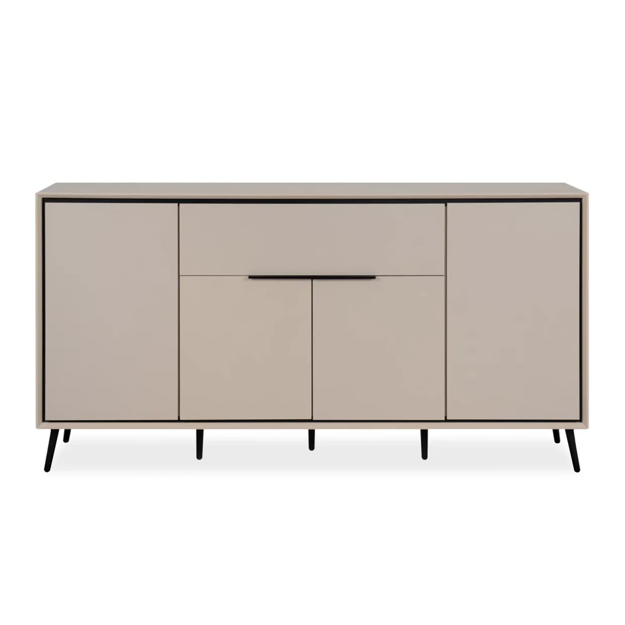 Die Falttür des Arona Sideboards besticht durch ihre moderne Eleganz und Funktionalität. In den Farben Sand und Schwarz gehalten, fügt sich das Möbelstück nahtlos in zeitgemäße Wohnräume ein und bietet eine harmonische Ergänzung zu verschiedensten Einrichtungsstilen.
