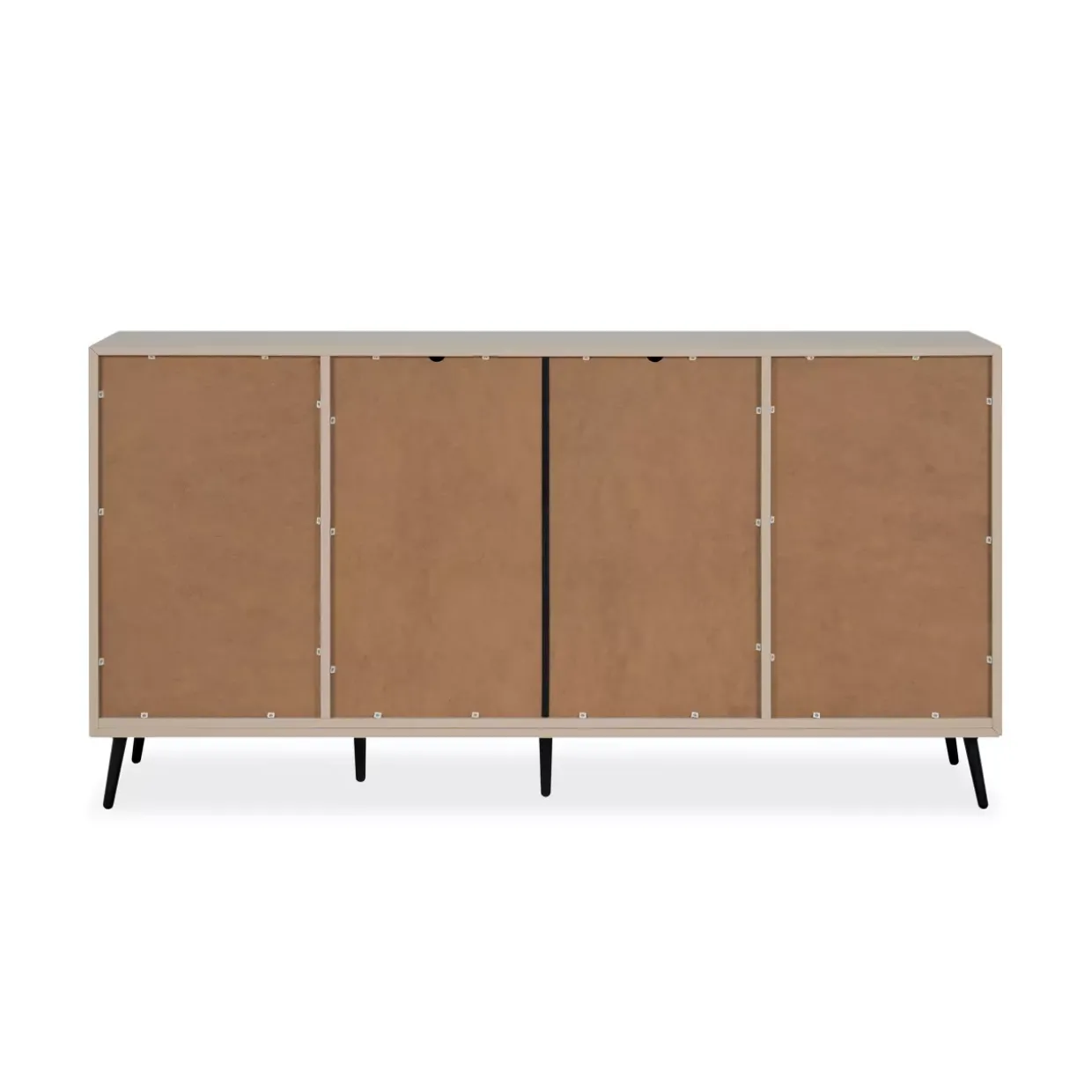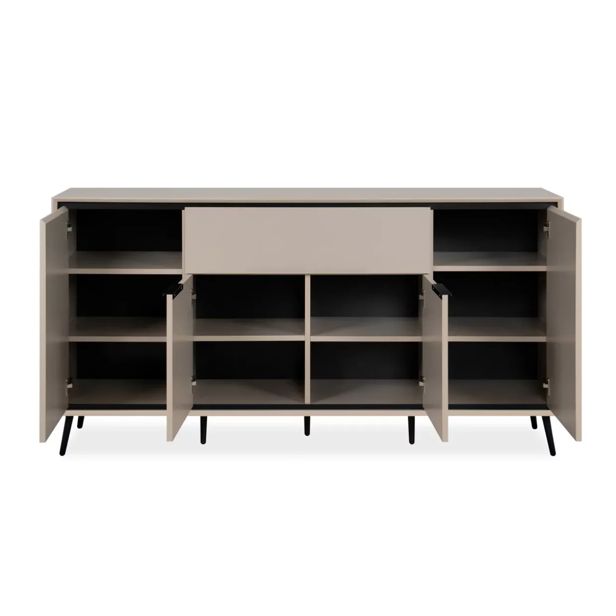 Holzwerkstoff als Material sorgt nicht nur für Stabilität, sondern auch für eine warme und natürliche Ausstrahlung, die in jedem Raum eine behagliche Atmosphäre schafft. Die mittleren Türen des Sideboards sind mit einer edlen Griffleiste aus Aluminium versehen, die einen ansprechenden Kontrast zum Holz bildet und gleichzeitig die Benutzerfreundlichkeit erhöht.