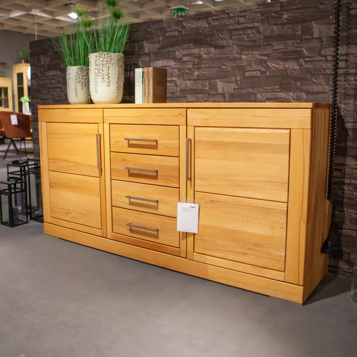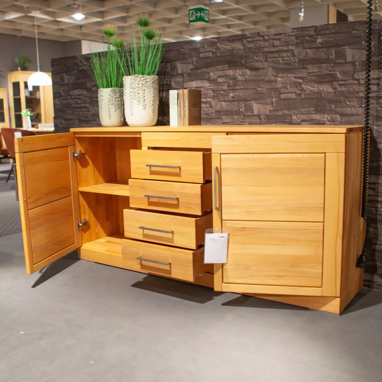 Geschmackvolle Eleganz trifft auf funktionale Vielseitigkeit. Das Sideboard bietet reichlich Stauraum, um Ordnung in Ihren Wohn- oder Essbereich zu bringen. Ob Geschirr, Bücher oder Accessoires, alles findet seinen Platz. Dabei wird das Auge stets von der faszinierenden Maserung der Rotkernbuche angezogen, die jedem Möbelstück eine einzigartige Note verleiht.