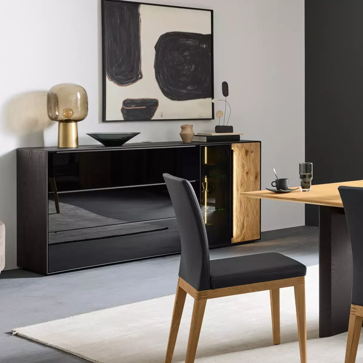 Ein elegantes Zusammenspiel aus Glas, Holz und Metall prägt das moderne Sideboard. Die Asteiche, schwarz geölt und stark gestrahlt in bianco, verleiht dem Möbelstück eine unverwechselbare Optik. Das Zusammenspiel dieser Holzarten mit dem gebürsteten Aluminium in Anthrazit schafft ein harmonisches Gesamtbild, das in jedem Raum zum Blickfang wird.Der funktionale Aufbau des Sideboards bietet mit einer oberen Klappe, zwei Schubkästen mit Glas V1 Spezial und einer Alurahmentür mit Glastür ausreichend Stauraum. Zwei Glasböden und eine Holztür mit zwei Holzböden sorgen für zusätzliche Ordnungsmöglichkeiten. Die Kombination dieser Materialien und Strukturen erfüllt nicht nur ästhetische, sondern auch praktische Ansprüche.Licht ins Dunkel bringt die passende LED-Griffleistenbeleuchtung. Die optionale LED-Einbaubeleuchtung sorgt für ein stimmungsvolles Ambiente und lässt sich bei Bedarf mit einem 4-Kanal-Funkdimmer erweitern. Die geölte und gebürstete Oberfläche des Sideboards verleiht ihm eine angenehme Haptik und unterstreicht den hochwertigen Charakter des Möbelstücks.Dieses Sideboard ist eine perfekte Wahl für Liebhaber moderner Wohnkultur, die Wert auf Qualität und Design legen. Es verbindet stilvolle Eleganz mit praktischer Funktionalität und verleiht jedem Raum eine besondere Note.