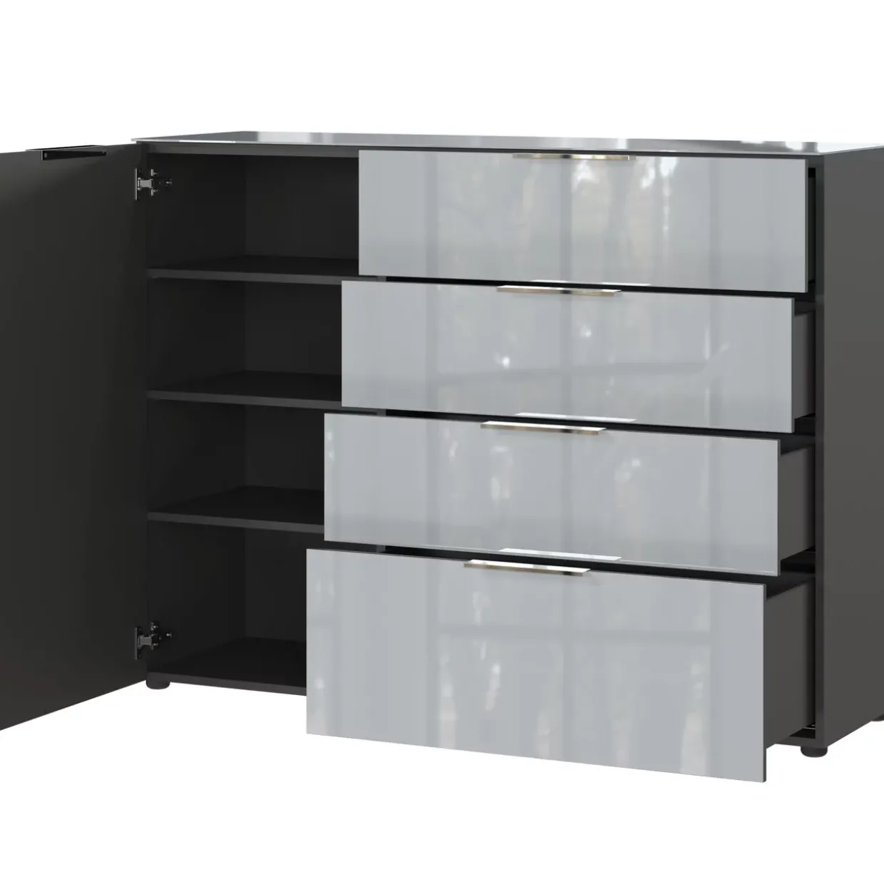 Funktionalität wird hier großgeschrieben: Vier Schubladen mit Soft-Close-Technik ermöglichen ein leises und sanftes Schließen, während eine Drehtür mit Türdämpfer den Zugang zu drei verstellbaren Einlegeböden eröffnet. Diese Flexibilität macht es einfach, den Innenraum nach Ihren Bedürfnissen anzupassen.
